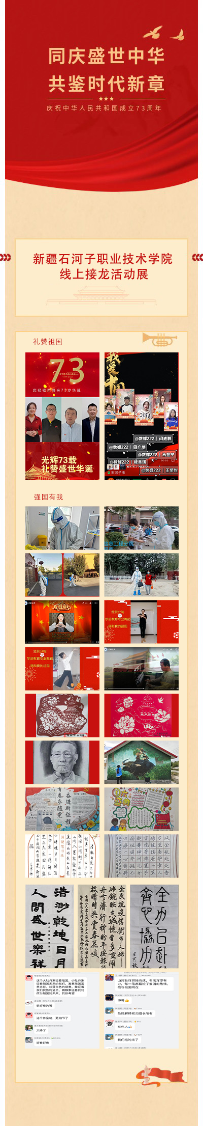 自10月1日起,学院师生的钉钉群、微信群被一条条对祖国母亲抒发爱意的信息刷屏。同学们以真挚的情感、朴实的语言、洪亮的嗓音、优美的舞蹈,把对祖国的热爱和赞美化成歌声与律动,祝福伟大祖国母亲,生日快乐;一把剪刀剪出一幅幅庄重喜庆的作品,记录了历史时代的变迁、讴歌了党的丰功伟绩、寄托了浓浓的家国情怀,表达了师生的美好祝愿;淡逸劲爽的国画、行云流水的书法,表白“与党同心,与国同行”,定格祖国的锦绣繁华,记录抗疫志愿服务和劳动实践的美好的青春模样。接龙活动精彩纷呈,广大石职院青年花式表达了爱党、爱国、爱校的赤忱之情,抒爱国情、立报国志,以赤诚之心守望鲜艳的中国红,是每一个人最坚定的追求,也是beat365唯一官方网站人对党、对祖国母亲最真挚的浪漫。