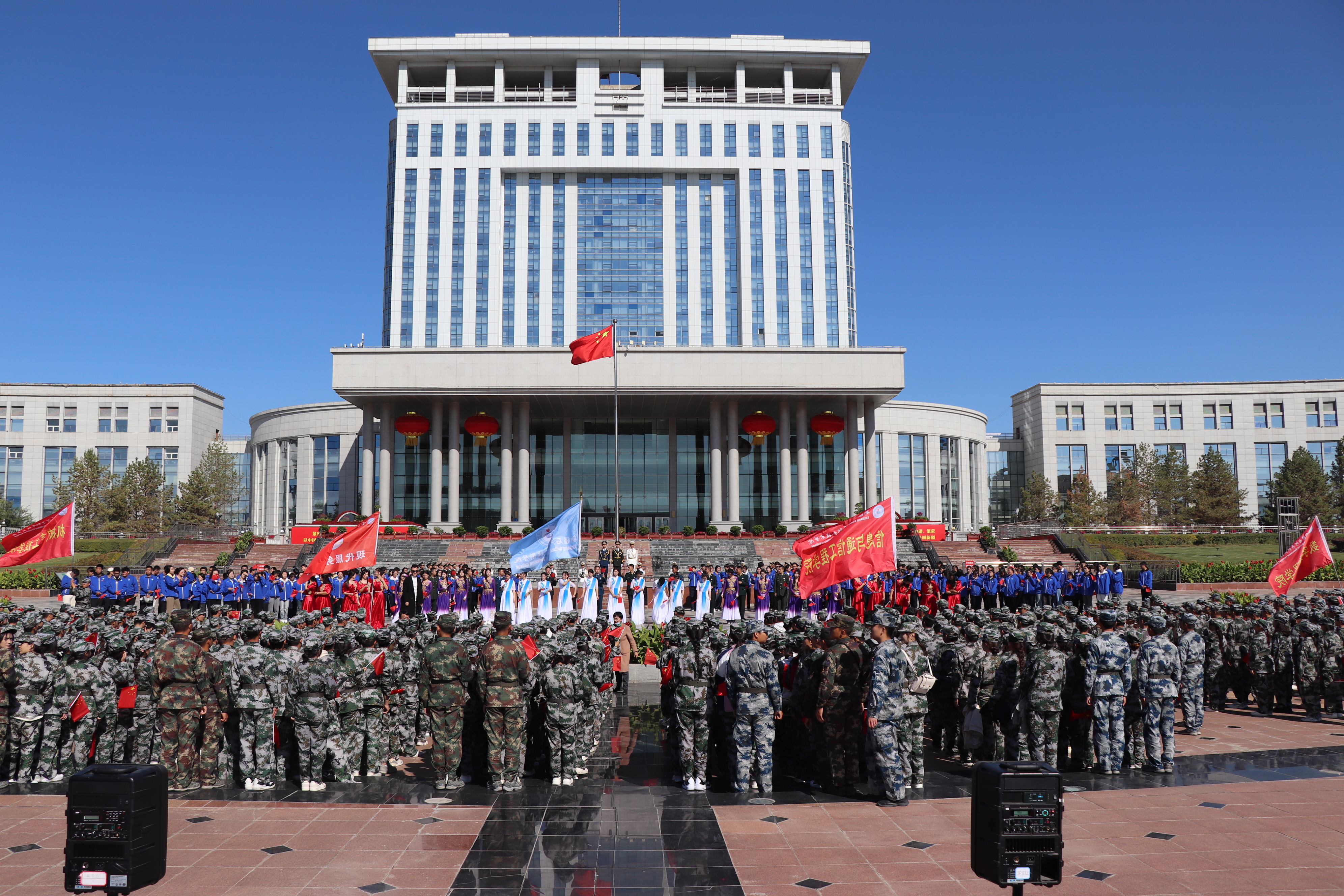 明珠广场上,只见由900名新生组成的气势如虹的方队,依次呈现“我爱祖国”“75”“我爱兵团”“70”“我爱石职”等字样,表达对祖国的热爱与祝福。“我和我的祖国,一刻也不能分割,无论我走到哪里,都流出一首赞歌……”近3000千名师生组成的合唱团面向国旗,高歌《我和我的祖国》。鲜红的国旗宛如一片红色海洋,歌声一浪高过一浪,激昂奏响爱国情怀的最强音,师生们用歌声和国旗共同绘制了一幅幅爱国画卷。