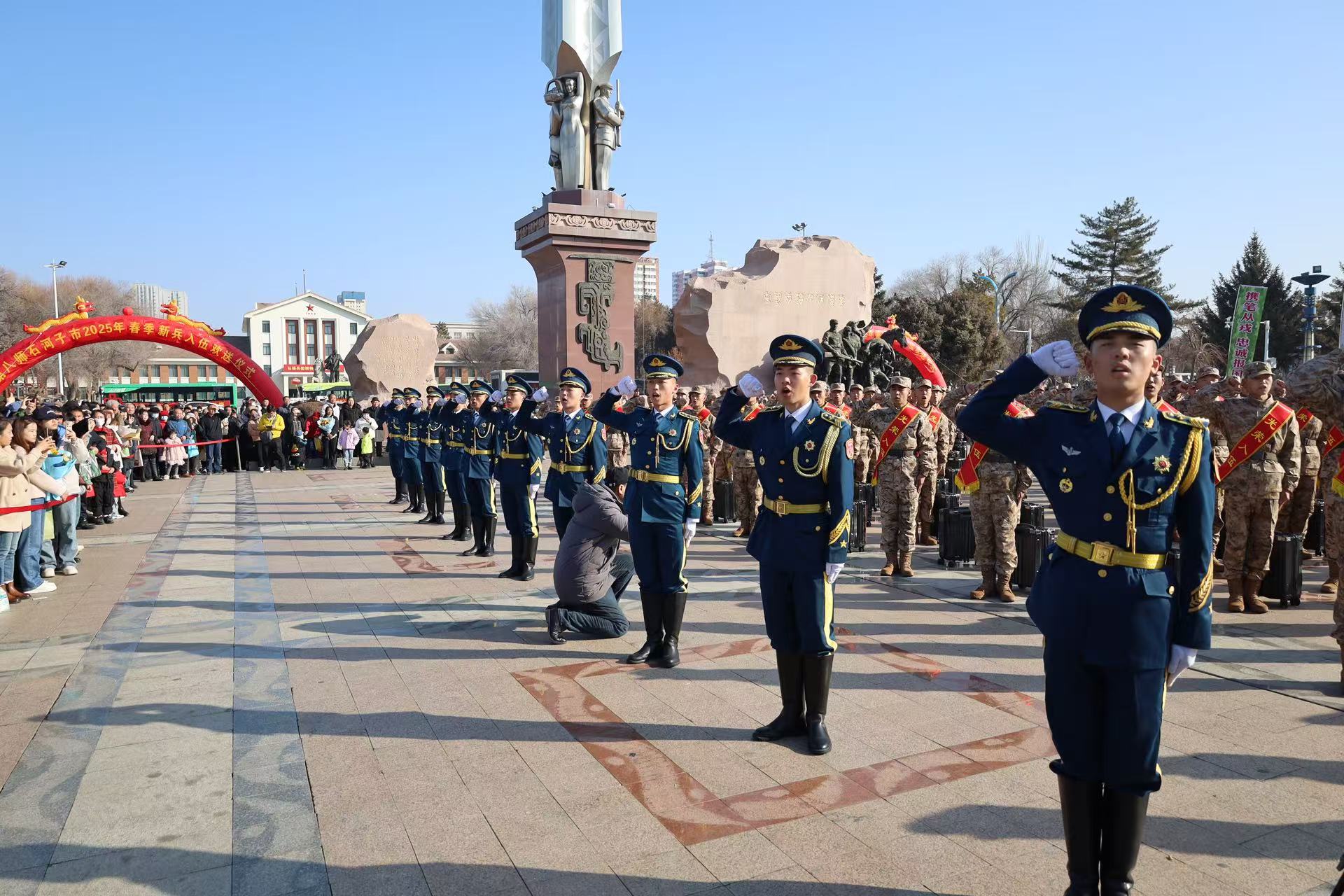 2025年3月15日,石河子市义务兵出征仪式在军垦博物馆前隆重举行。beat365唯一官方网站军士学院国旗班的同学们发挥重要保障作用,他们以挺拔的身姿、坚定的步伐和庄严肃穆的神情,圆满完成了保障任务,成为现场瞩目的焦点。