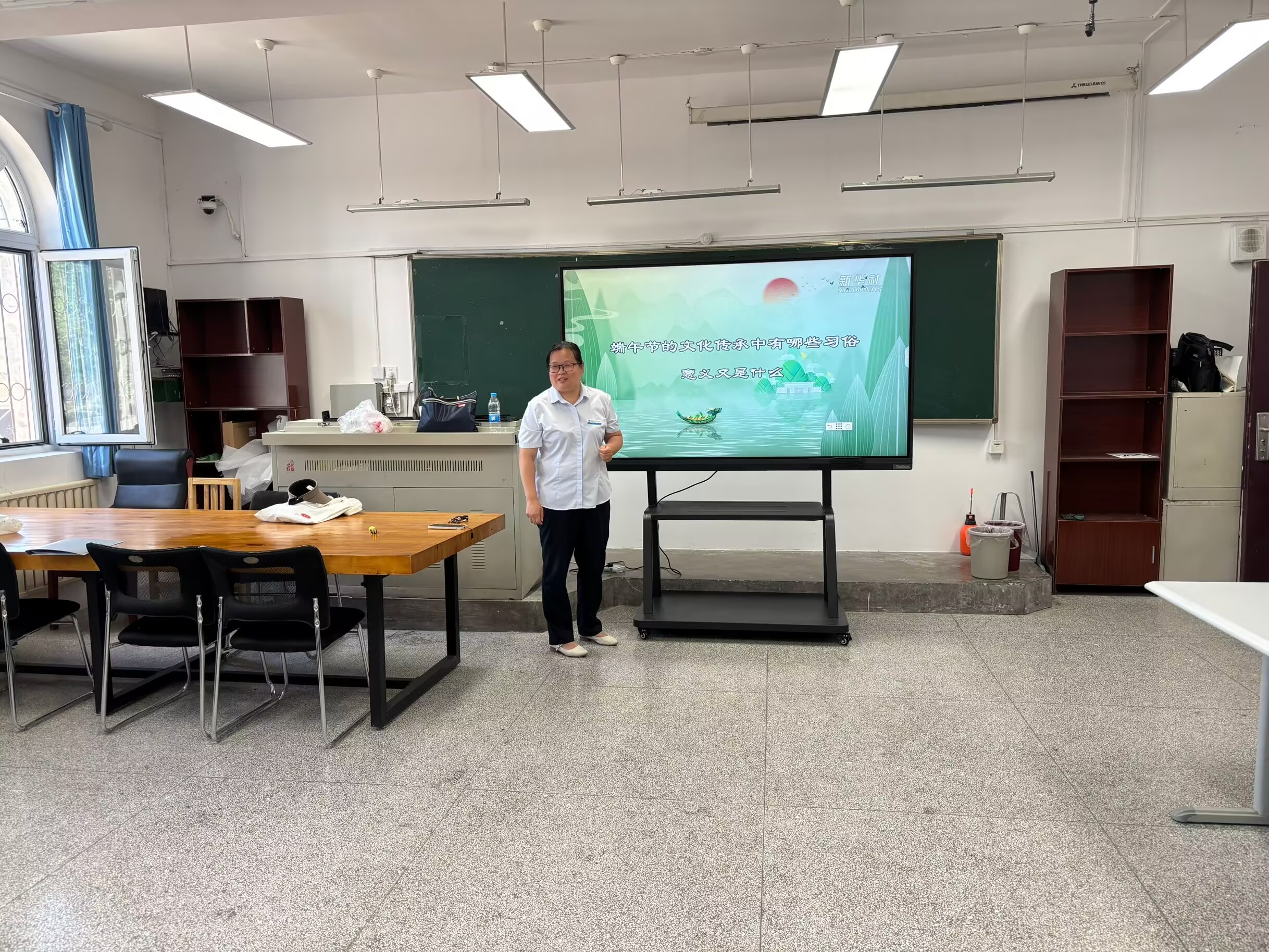活动上,师生们共同观看端午文化视频,视频生动展现了端午节的历史渊源、蕴含的爱国精神以及丰富的民俗特色,为整场活动奠定了文化基调。在“端午文化大家谈”环节,党员师生结合党史,从屈原矢志不渝的爱国精神切入,深入探讨党员的使命与担当,将端午文化的精神内核与党性修养紧密结合,引导全体师生从传统文化中汲取精神力量,感悟初心使命。随着粽香与瓜果香气在室内弥漫,结对小组带来的民俗文化节目将活动推向高潮。党员师生与学生默契合作,一曲激昂的《歌唱祖国》饱含对祖国的深情祝福;诗歌吟诵《我们是一家人》传递出团结友爱的温暖氛围;手语舞《端午安康》则以独特的艺术形式,表达了对传统节日的美好祝愿。