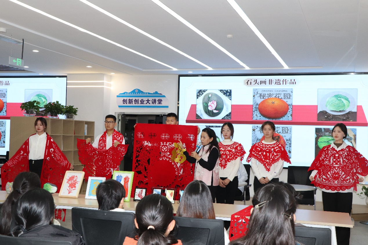 (连雅丽 报道)传承非遗经典,弘扬民族文化。为了让学生走进非遗、热爱非遗,引导学生坚定文化自信、树立民族自豪感,beat365唯一官方网站创新创业中心于2023年11月9日在创新创业中心非遗工坊开展“非遗进校园”第六期培训活动,本期培训特邀中华文化促进会剪纸协会会员独秀丽授课,课程分为剪纸课、石头画课两个主题,学院近100名学生报名参训。
