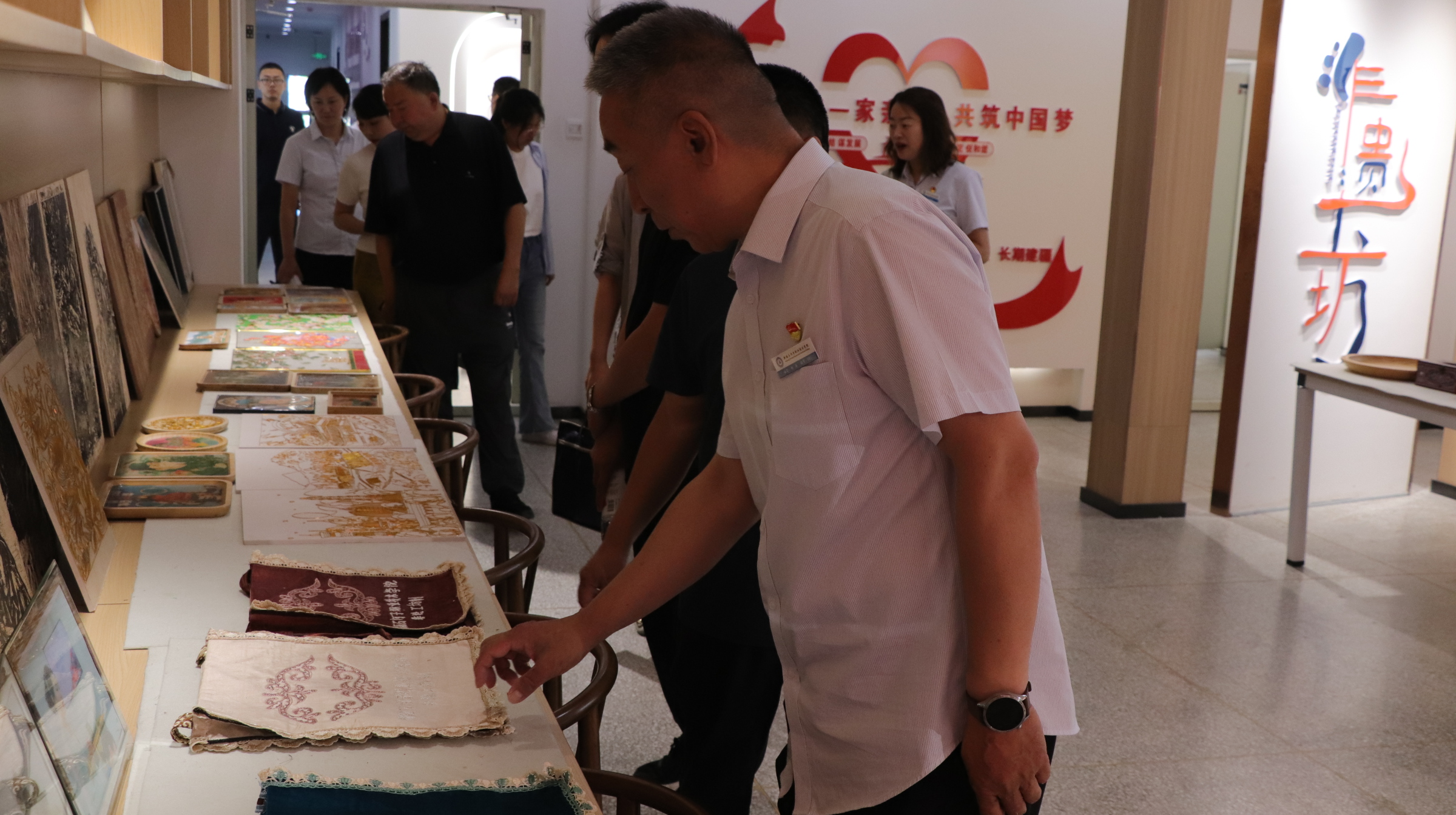 在非遗工坊,一幅幅剪纸作品线条灵动,一块块石头画栩栩如生,一件件土陶制品质朴又不失创意,这些充满巧思的作品早已走出工坊,走进现代生活场景,生动诠释“守正不守旧,创新不忘本”的理念,让古老非遗技艺在创新浪潮中绽放全新光彩。杨涵老师向各位领导介绍道:“学院始终致力于将传统技艺的深厚底蕴融入创新教育体系,在这里,同学们不仅能学习石头画、剪纸等非遗技艺,更能以当代审美为笔,在传承中创新。”
