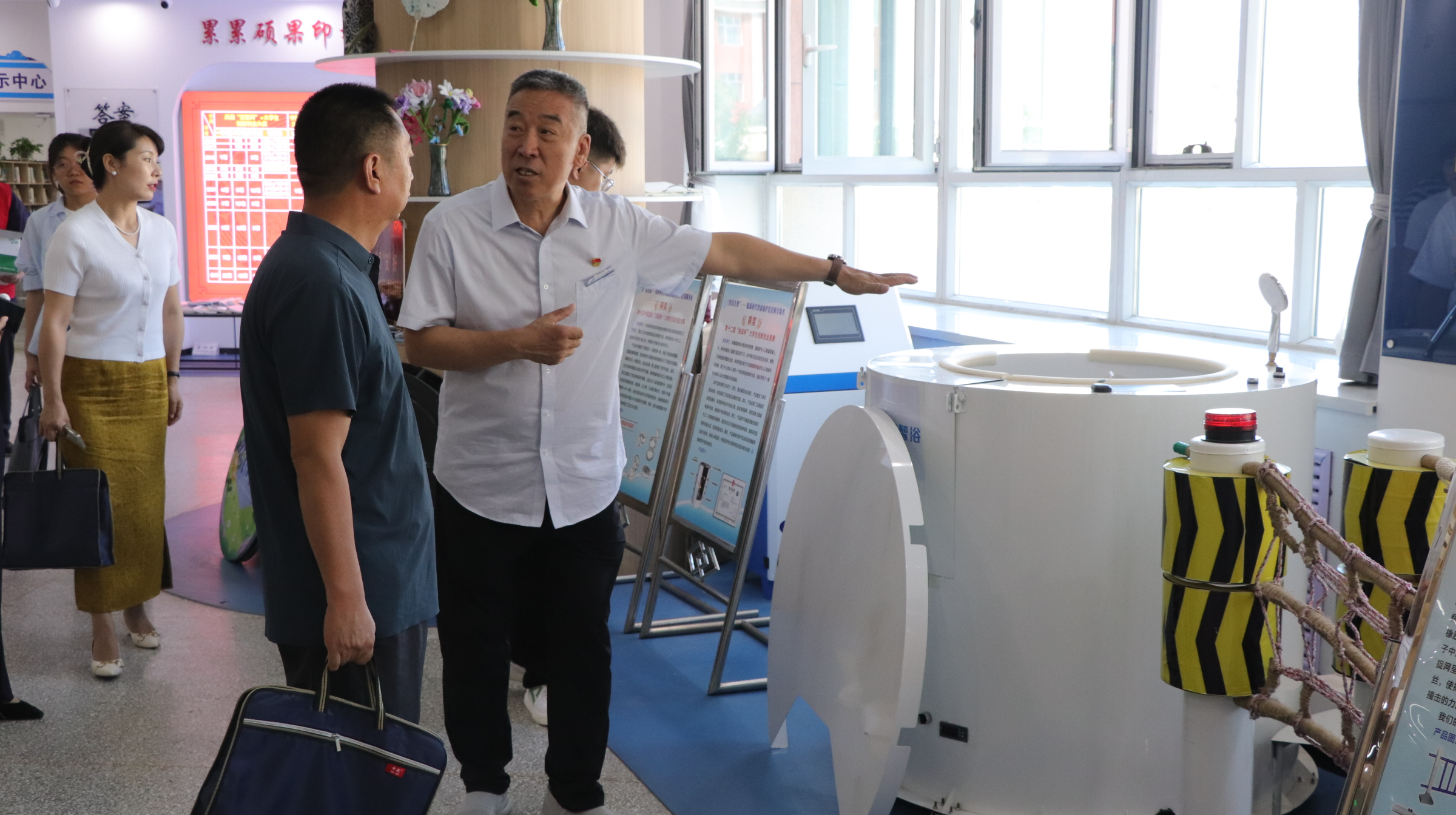 在双创成果展示厅,涵盖人工智能、生态农业等领域的20余项师生创新成果集中亮相。其中,“破冰行动”项目组的科技成果凭借攻克技术难题的实力和良好的市场应用前景成为焦点。张展副主任与杨涵老师围绕双创成果转化展开深入探讨,对构建更完善、更具活力的创新生态提出殷切期望,让创新成果真正服务区域经济发展。