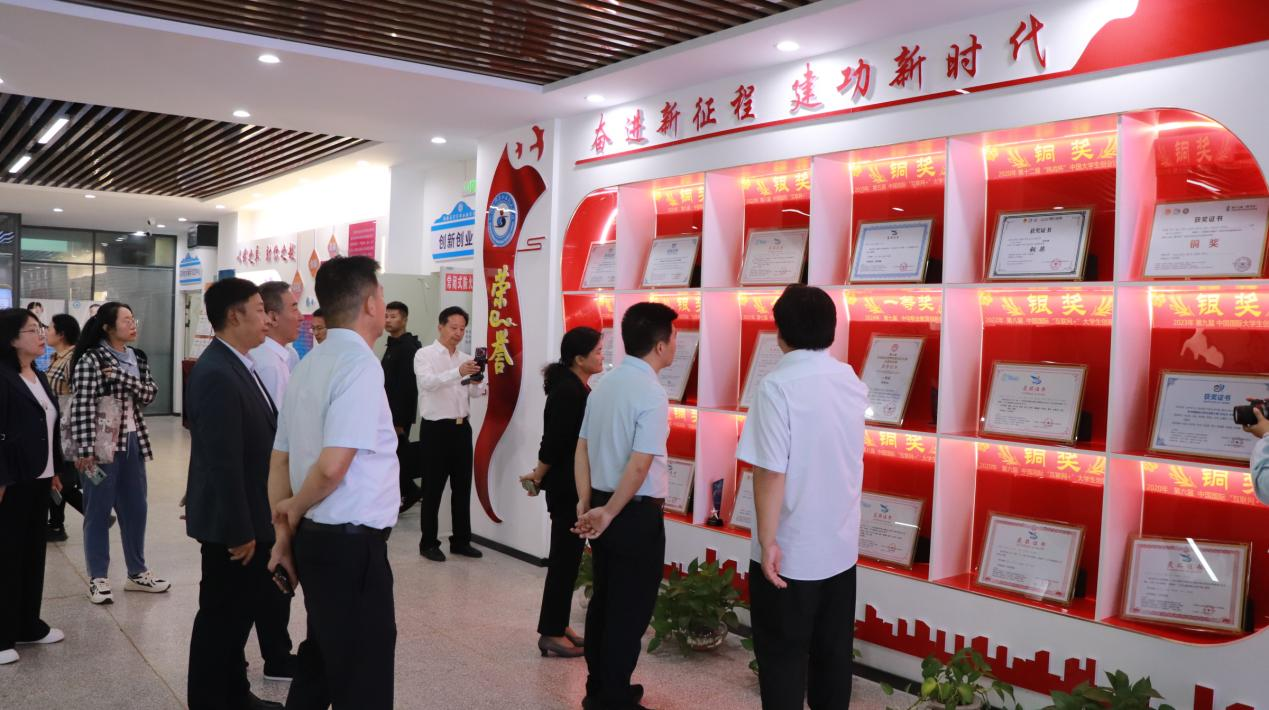 考察组一行走进学院非议工坊、双创大讲堂、双创科技成果展厅等特色功能区域。在学院讲解人员的引导下,考察团详细了解了学院在传统技艺活态传承、创新创业教育课程体系搭建、近年来创新创业领域获得荣誉以及学生团队研发的具有市场竞争力的科技成果等核心工作。调研期间,考察组聚焦产教融合育人模式、各类双创大赛组织参与情况、校企合作深度推进举措等重点内容,尤其关注在人社部门政策支持、资金对接等助力下,学院双创项目的落地转化路径、实际成效及面临的挑战,并对学院在课程体系系统化建设、产教融合与校企协同育人、双创成果孵化方面的积极努力与显著成效给予充分肯定。