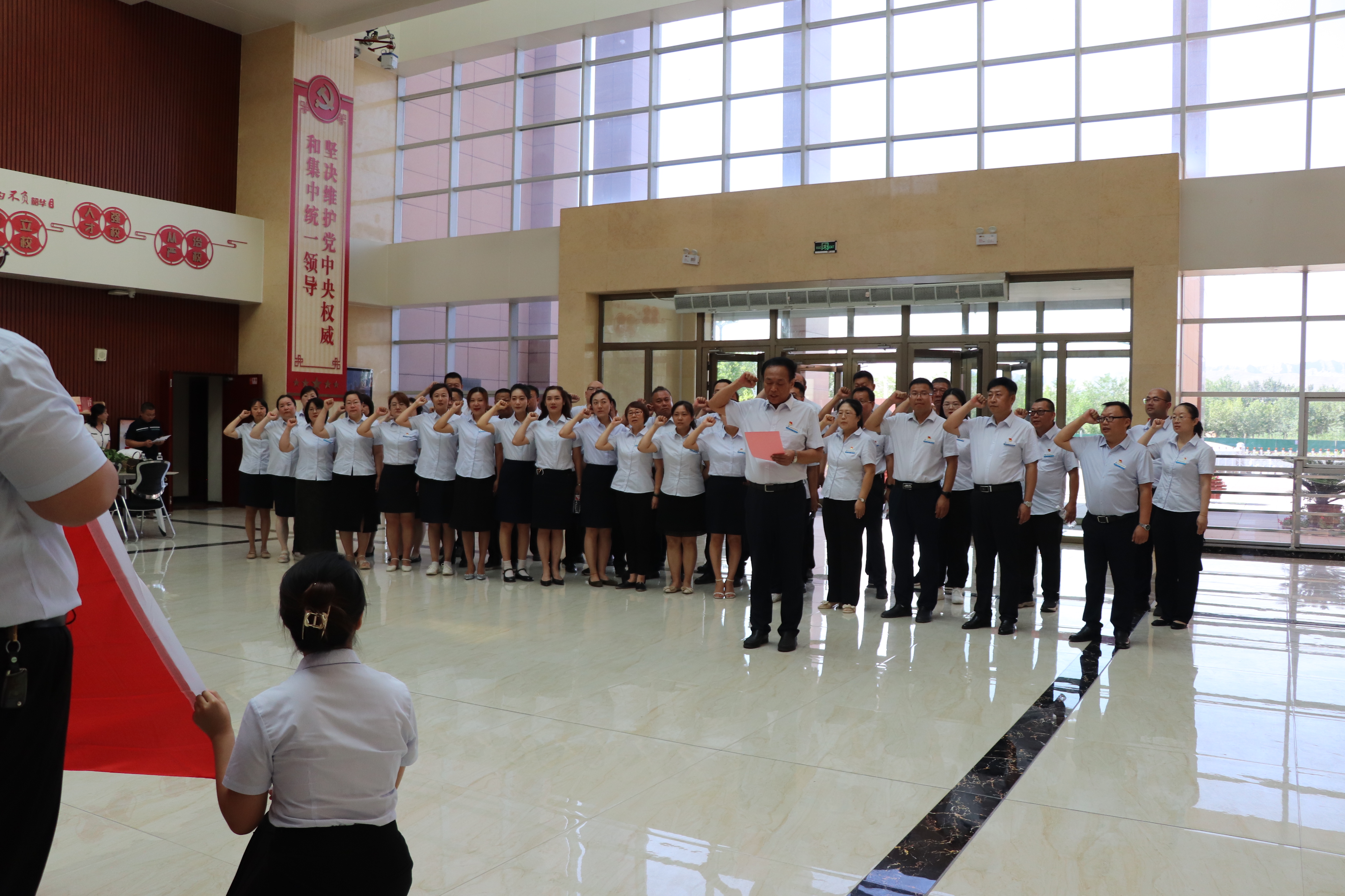 党课结束后,全体党员干部在党旗下庄严宣誓,重温入党誓词。他们紧握拳头,神情肃穆,用铿锵有力的誓言表达了对党的忠诚和坚定信念,这一环节不仅让党员干部们的心灵受到了洗礼,也进一步增强了他们的党性修养。