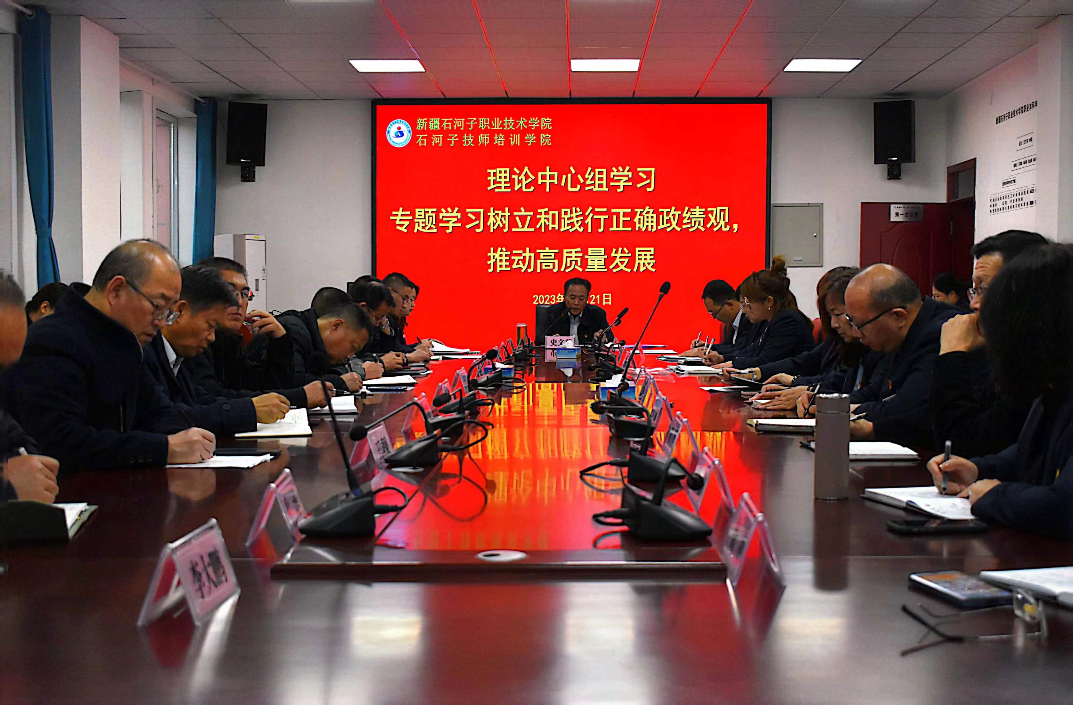 (王需 杨慧报道)2023年11月21日下午,beat365唯一官方网站党委在行政楼3楼会议室举行第25次理论中心组集体学习(扩大)会议,“专题学习树立和践行正确政绩观,推动高质量发展”,党委书记史文革主持会议,学院副院长马彩梅,各部门、分院负责人参加会议。