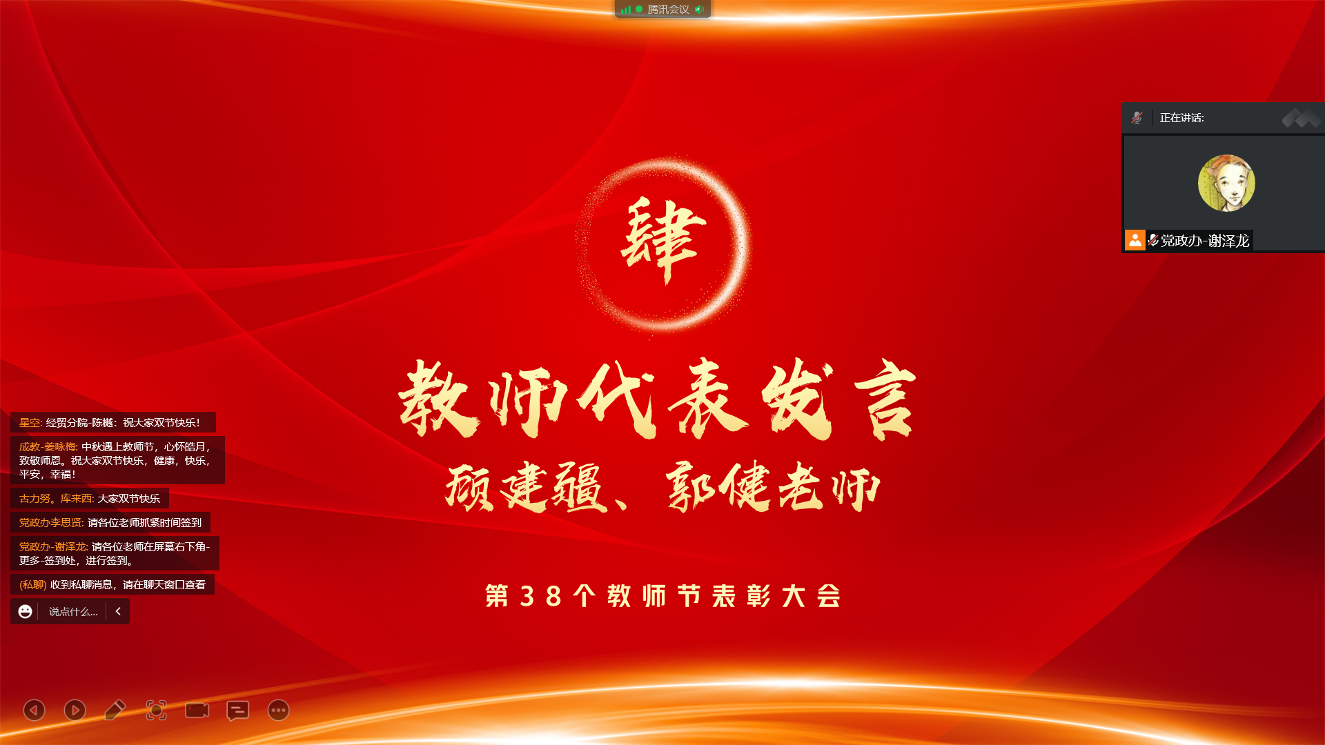 机械电气工程分院郭健代表教师发言,展示了在学院提供的优秀平台之下取得的硕果累累,她参与学院国家级省级质量工程项目5项,带领团队教师连续参加全国、兵团等各类比赛,共获国家二等奖1项,省级一等奖2项、二等奖4项、三等奖8项;机械电气工程分院顾建疆作为教师代表发言,讲述了自己34年职教生涯,从懵懂青年成长为名师工匠的人生历程;士官学院黎明昊代表学生发言,感谢老师对自己的辛勤培育,帮助自己登上了技能大赛国赛的舞台,向梦想越来越靠近。
