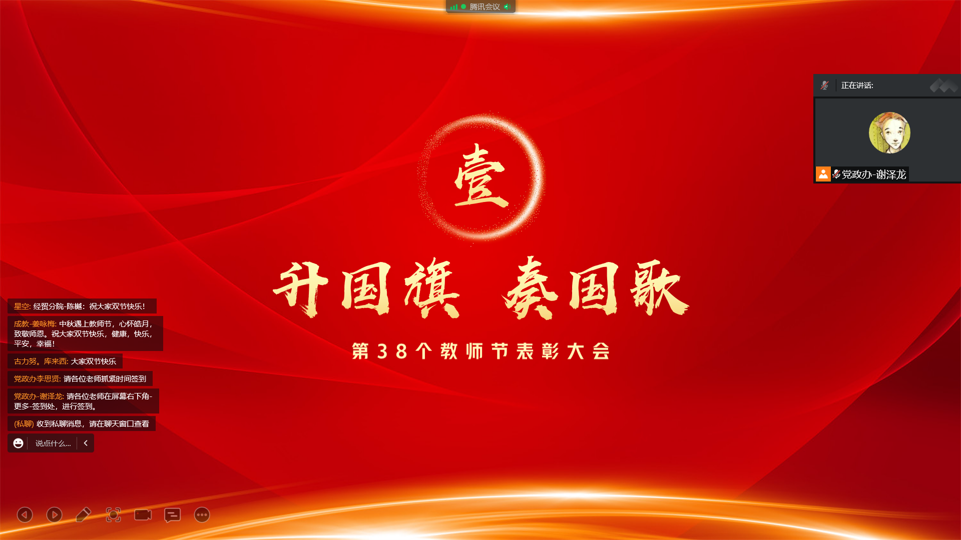 学院党委书记史文革做总结发言,代表学院党委向在抗疫前线昼夜奋战、在教育教学一线辛勤耕耘、在管理服务一线无私奉献的全体教职员工,致以节日的问候和美好的祝愿,向受到表彰的优秀教师、优秀班主任、教学能手、师德模范、疫情防控先进个人、优秀教育工作者和突出贡献奖的127名教师致以热烈的祝贺,总结了一年来学院在全体教职工的共同努力下取得的一系列成绩,号召大家要按照习近平总书记提出的期望与要求,牢记立德树人使命,以教书育人模范为追求,人人争当政治强、情怀深,善创新、教风严、甘奉献、师风正的“大先生”,齐心协力将学院打造成兵团一流的技术技能人才培养高地!用实际行动迎接党的二十大胜利召开!