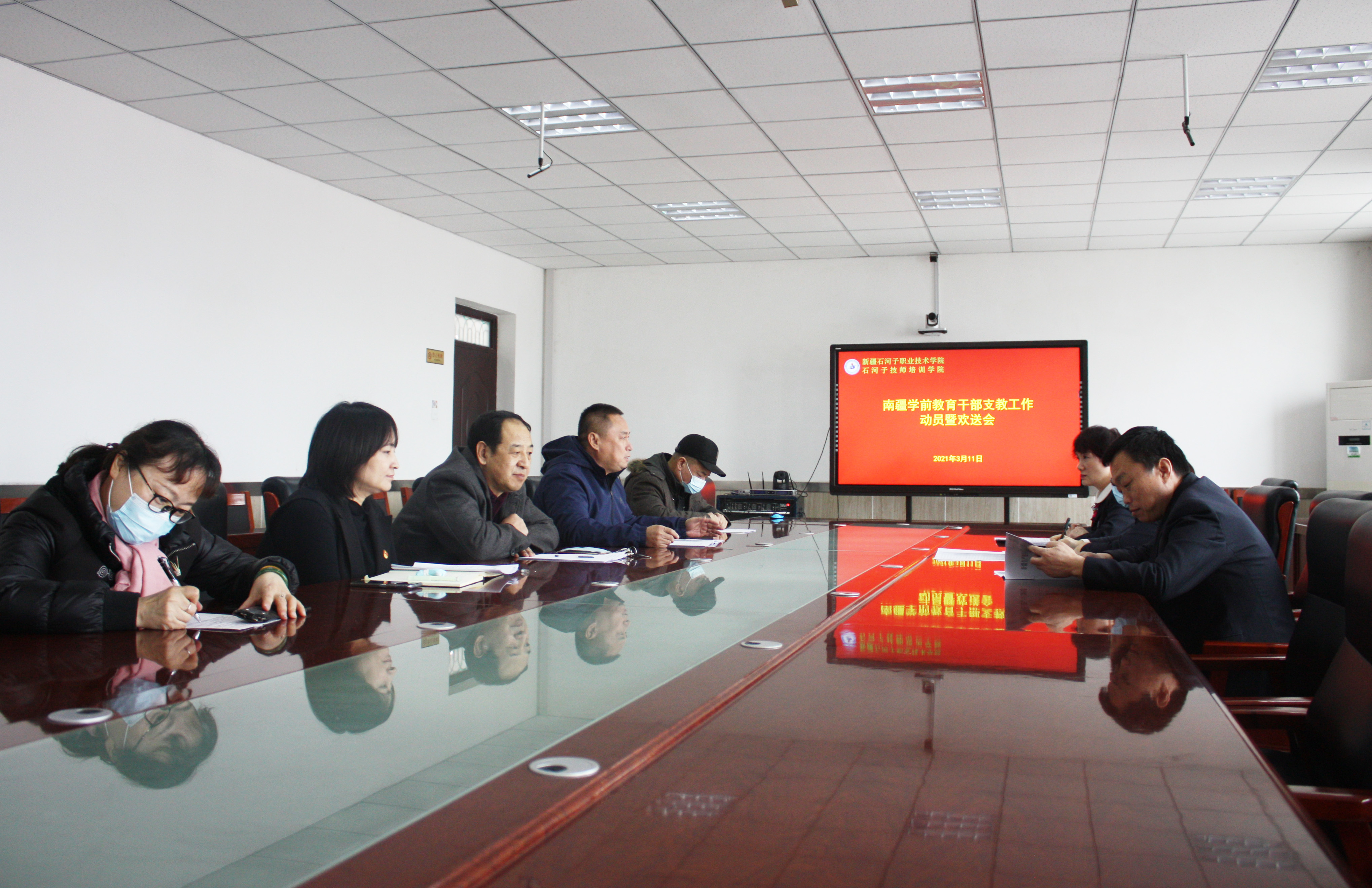 为落实师市2021年南疆学前教育支教工作会议精神,学院党委书记史文革、院长林炯对南疆学前教育支教工作高度重视。3月11日上午学院组织召开了南疆学前教育干部支教工作动员暨欢送会。会议由纪委书记周赞梅主持,党政办副主任杨继芳、后勤管理中心书记蒋巍、后勤管理中心主任宋世明、思政部主任张敏、相关部门教师、赴南疆地区支教教师石巨文、宋建云等参加了会议。