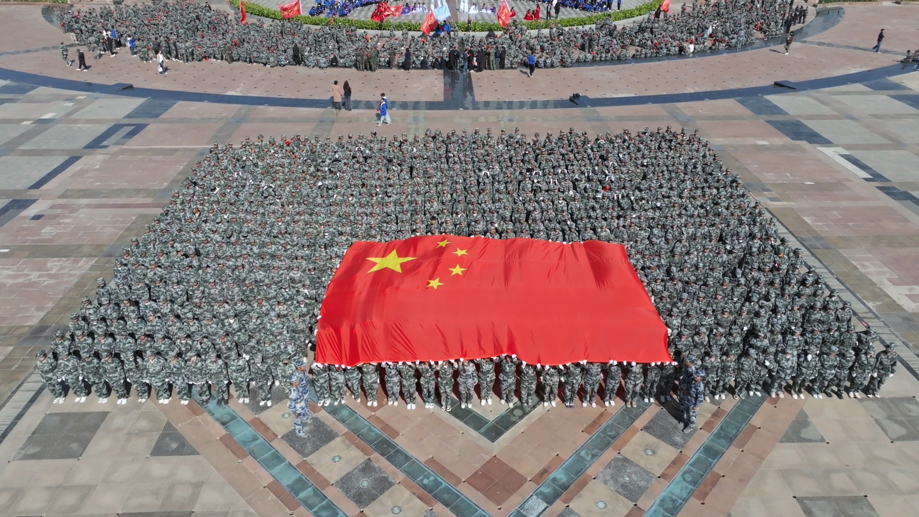 明珠广场上,只见由900名新生组成的气势如虹的方队,依次呈现“我爱祖国”“75”“我爱兵团”“70”“我爱石职”等字样,表达对祖国的热爱与祝福。“我和我的祖国,一刻也不能分割,无论我走到哪里,都流出一首赞歌……”近3000千名师生组成的合唱团面向国旗,高歌《我和我的祖国》。鲜红的国旗宛如一片红色海洋,歌声一浪高过一浪,激昂奏响爱国情怀的最强音,师生们用歌声和国旗共同绘制了一幅幅爱国画卷。