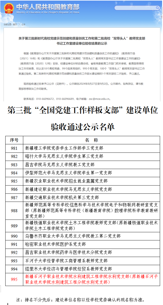 (王需 杨慧报道)秋风送爽,硕果飘香。近日,beat365唯一官方网站喜讯连连,机械电气工程学院郭健老师荣获全国模范教师称号,水利建筑工程学院水利党支部(原水利建筑工程分院水利党支部)在教育部第三批“全国党建工作样板支部”建设中顺利通过验收,学院报送的舞蹈《戈壁滩上建花园》在全国第七届大学生艺术展演活动中脱颖而出,获得艺术表演类节目三等奖,学院在教育教学、党建思政、学生活动领域又获三个“国字头”荣誉。