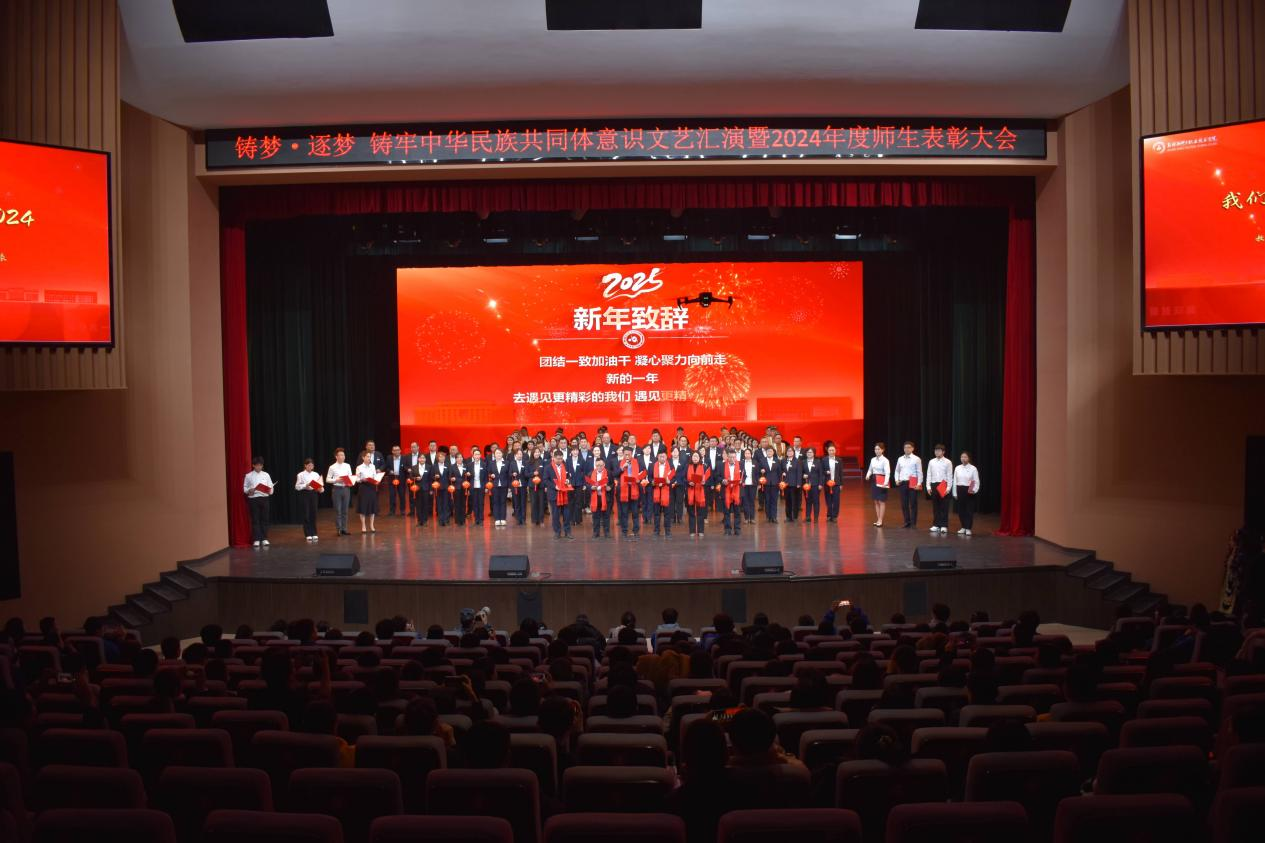 12月,学校举办以“铸梦·逐梦” 铸牢中华民族共同体意识为主题的文艺汇演暨2024年度师生表彰大会,对2024年在教学、技能、社会实践等方面取得优异成绩的242个项目获奖师生进行了表彰,各二级学院纷纷呈上具有专业特色的节目,以歌曲、舞蹈、朗诵、话剧等多种艺术形式,聚焦铸牢中华民族共同体意识主线,为一整年的努力画上句号。