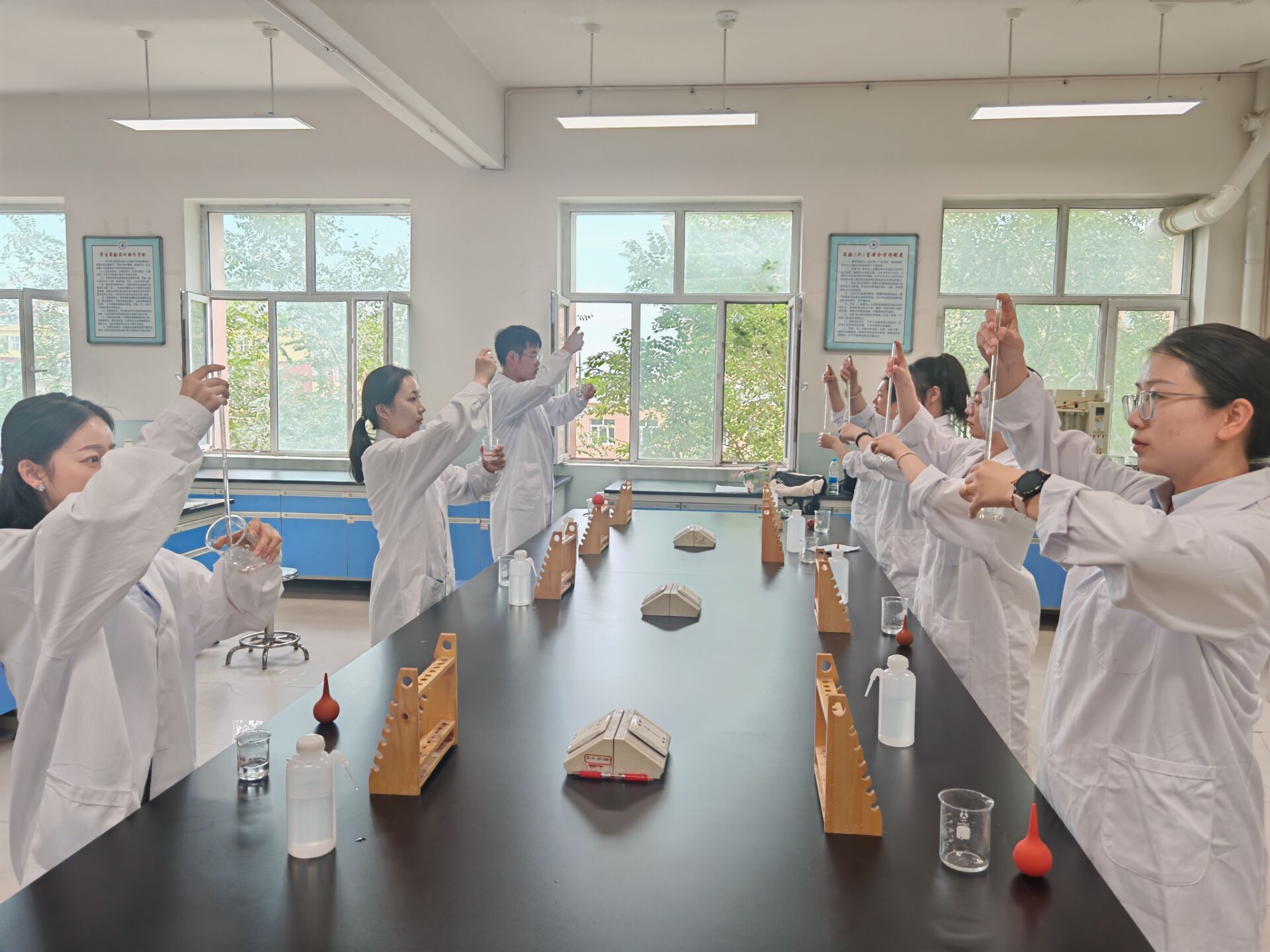 在师资队伍方面,本专业拥有一支学科结构合理、教学经验丰富、具有创新活力的教师团队。现有专任教师共计15人,其中教授4人,正高级工程师1人,副教授4人,高级职称占比高达66.6%。专任教师团队中,硕士占比93.3%,博士占比20%,“双师”型教师占比60%,聘请企业、行业专家和技术能手作为兼职教师,负责专业课程和实践技能课程的教学工作。目前教师团队参与国家级课题 2 项,省级课题10项,发表论文60余篇,申报专利及软著30余项。教学团队在第四届全国高校混合式教学设计创新大赛中,荣获优胜奖1项;在全国职业院校食品类专业(群)教师教学能力比赛中,荣获一等奖1项,三等奖1项;在兵团高职院校技能大赛教学能力比赛中,荣获一等奖7项,二等奖6项;在兵团职业院校现场课大赛中,荣获一等奖2项,教学基本功大赛二等奖1项。