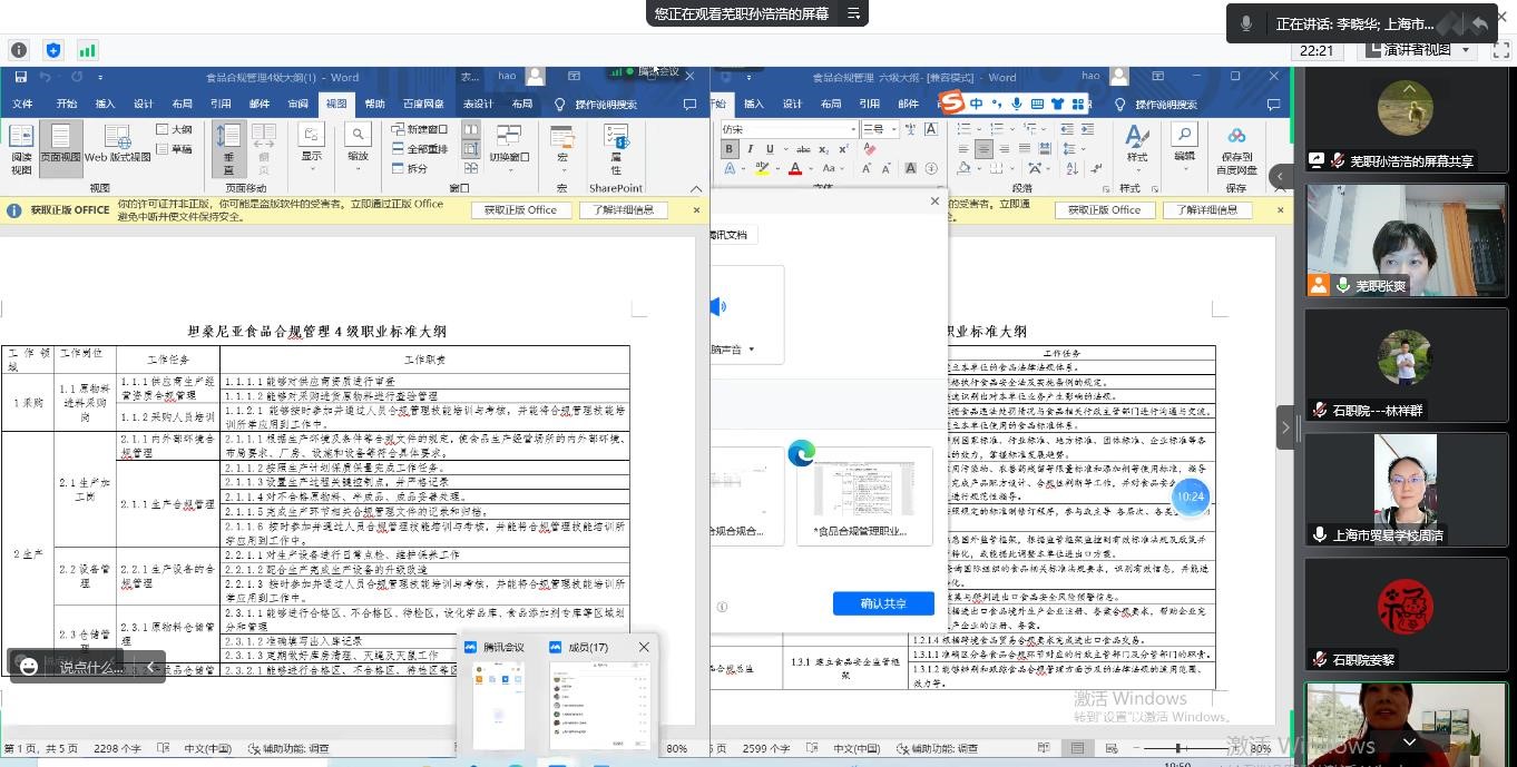 2022年11月28日晚,轻纺化工分院副院长李晓华组织食品智能加工技术专业群食品合规管理标准开发项目组成员姜黎、林祥群、唐文娟、岳燕燕、赖凡联合芜湖职业技术学院食品与生物工程学院以及上海市贸易学校三所高校共18人参加食品合规管理4-6级职业标准线上研讨会。