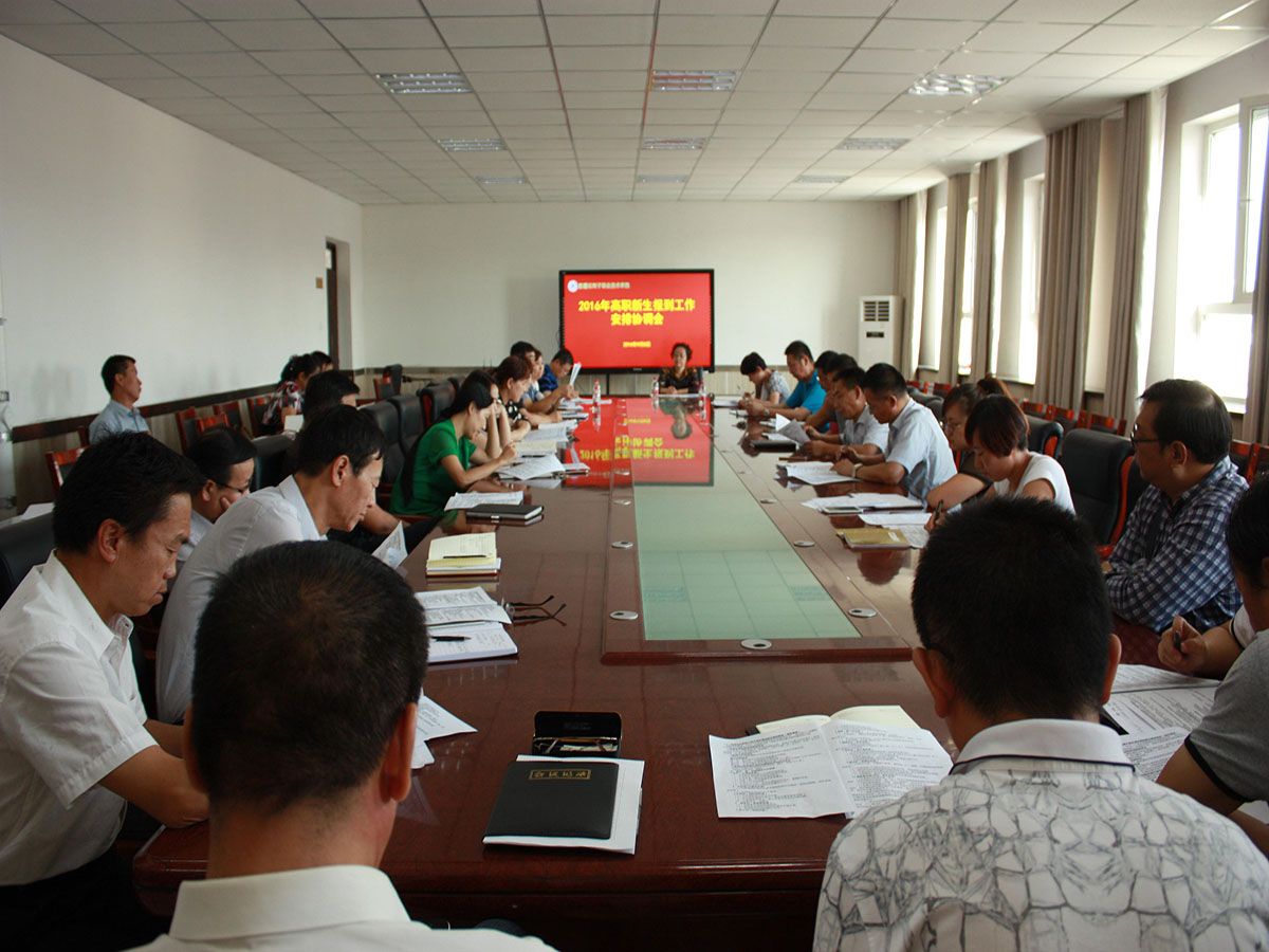 招办主任宫崇勇宣读了《2016年高职新生报道工作安排》,就新生接待安保与车辆安排、新生入学宿舍安排、后勤服务、新生费用收缴等工作做了通报与说明。