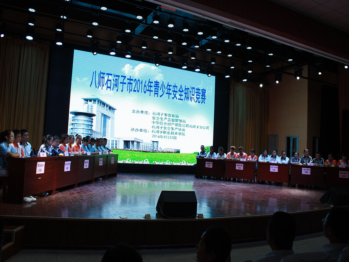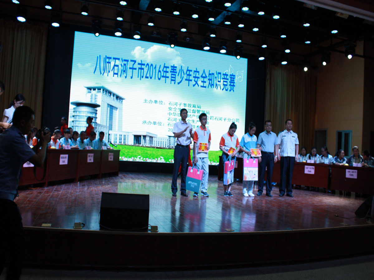 9月23日上午,八师石河子市2016年青少年安全知识竞赛在beat365唯一官方网站举行,师市安监局、教育局、学院领导、中华联合保险公司、安全协会、公安交警、食药局、地震局、综治办、公安消防、禁毒支队、艾防办、消协等相关部门领导现场观看比赛并为获奖选手颁奖。