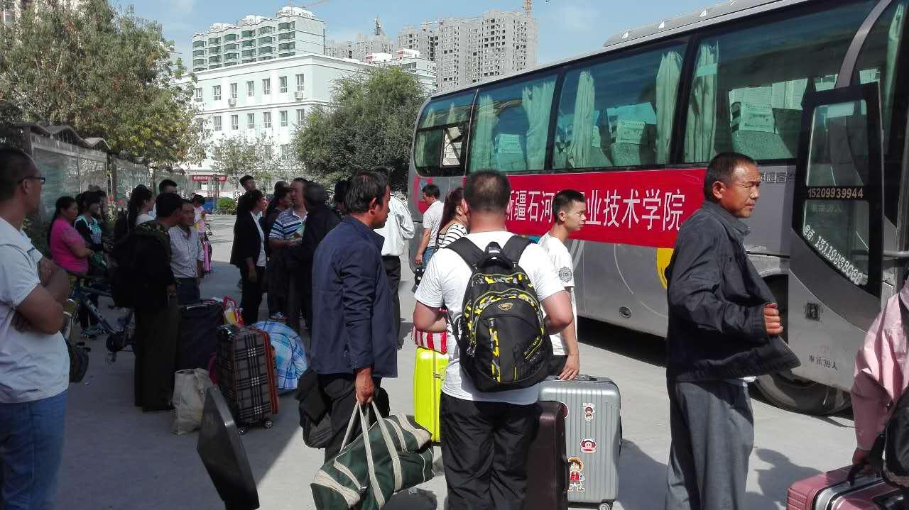 图为新生坐接站专车入校