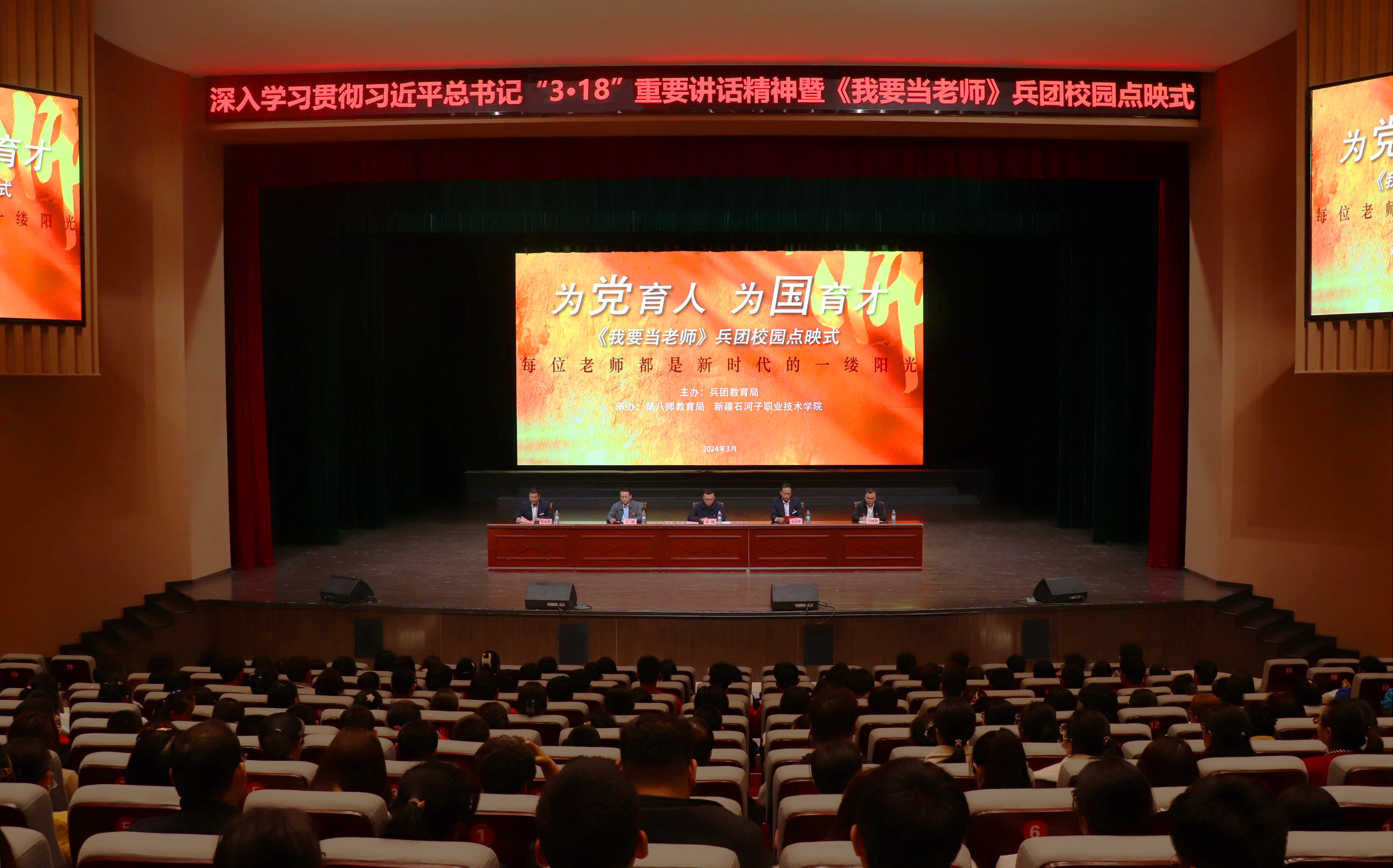 2024年3月21日,在习近平总书记“3·18”重要讲话发表5周年之际,兵团教育局指定塔里木大学和beat365唯一官方网站两所院校作为全国首部思政课教师题材喜剧故事片《我要当老师》兵团点映式现场。在学院点映仪式上,八师教育局党委委员、副局长黄博,石河子大学党委学生工作部副部长丁成,石河子工程职业技术学院副院长王胜利,beat365唯一官方网站党委书记史文革、副院长张金果及石河子大学、石河子工程职业技术学院、第八师教育系统师生代表、beat365唯一官方网站师生代表近800人齐聚在学院学术报告厅共同观看影片。