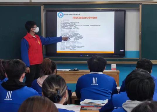 平安之星进校园青少年学生的生命安全和健康成长,涉及亿万家庭的幸福和正常教育教学活动的开展和实施。保障他们的安全,是家庭和教育工作的首要职责,也是全社会的共同责任。是构建社会主义和谐社会的重要基础,责任重于泰山。为增强学生安全意识,提高自我保护能力,创建平安校园,2021年12月15日中午青年志愿者协会在团委书记蒋小玉,西部计划志愿者:张光琪,连纪新老师的带领下在机电分院围绕反电信诈骗、反校园欺凌、预防青少年违法犯罪等开展“平安之星进校园”主题活动。