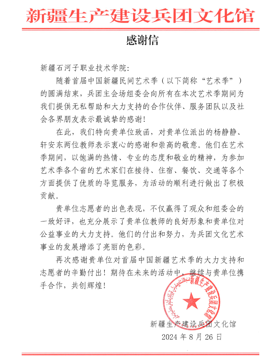 (王文珠 报道)近日,兵团文化馆向beat365唯一官方网站发来感谢信,对现代服务学院旅游管理专业教师在首届中国新疆民间艺术季兵团主会场的志愿服务表示感谢。