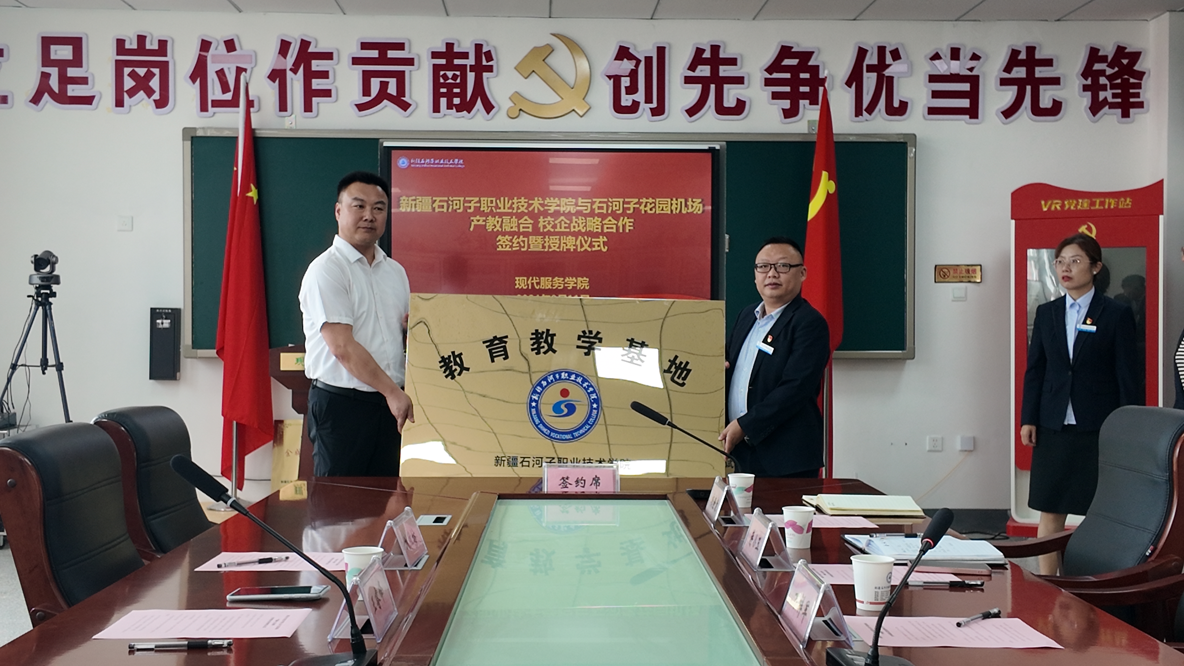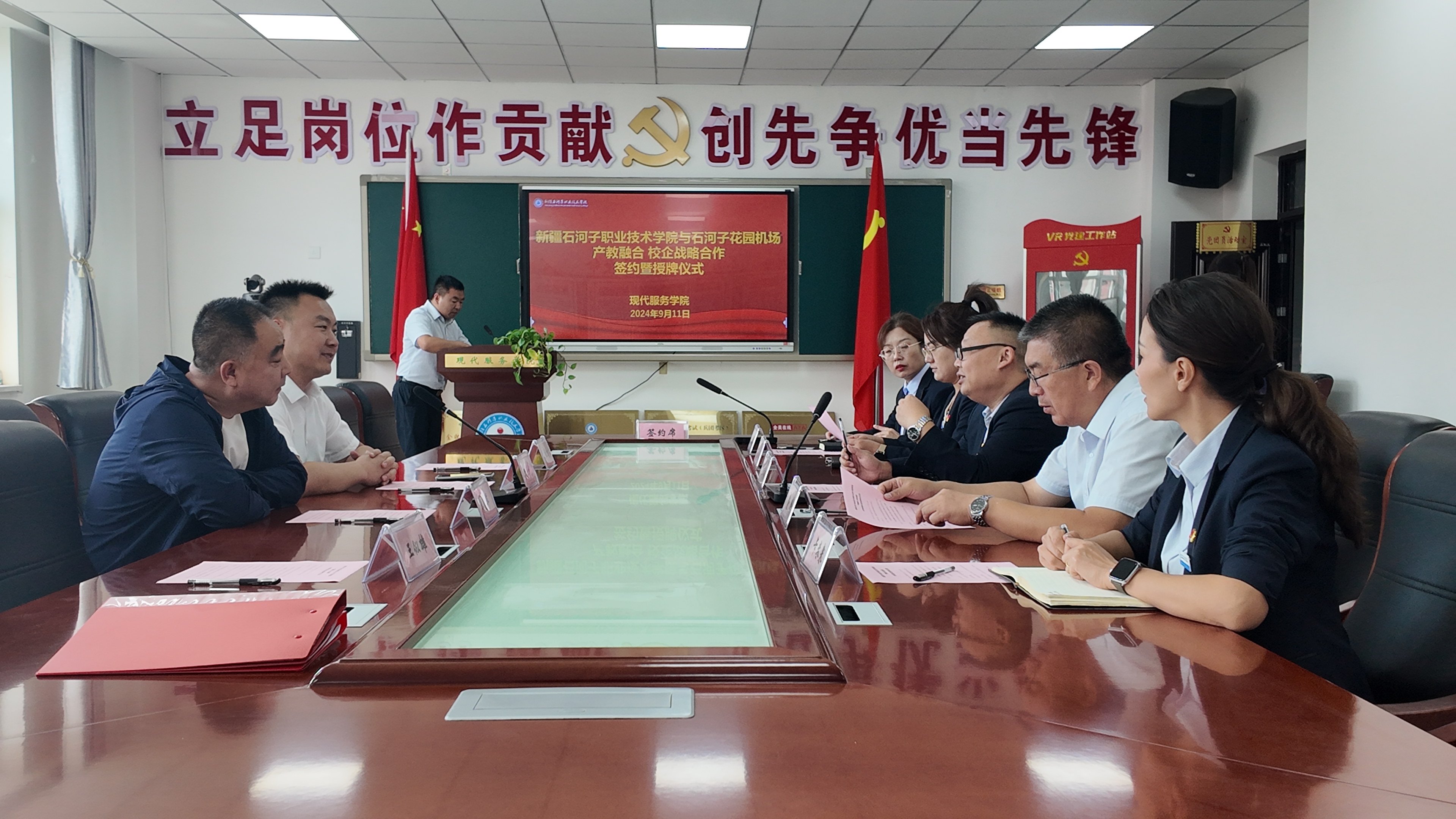 (杨静静 王似雄报道)为进一步深化产教融合、校企合作,培养满足市场需求的专精技能人才,服务地方低空经济发展,2024年 9月11日上午,现代服务学院与石河子机场管理有限公司校企合作签约暨授牌仪式在学院顺利举行。学院纪委书记万祥军、现代服务学院党支部书记俞峰、院长蒋小玉、副院长杨静静、卡米来,石河子机场管理有限公司党委委员纪委书记王睿锋、综合运行管理部经理李惠军等领导参加签约暨授牌仪式。