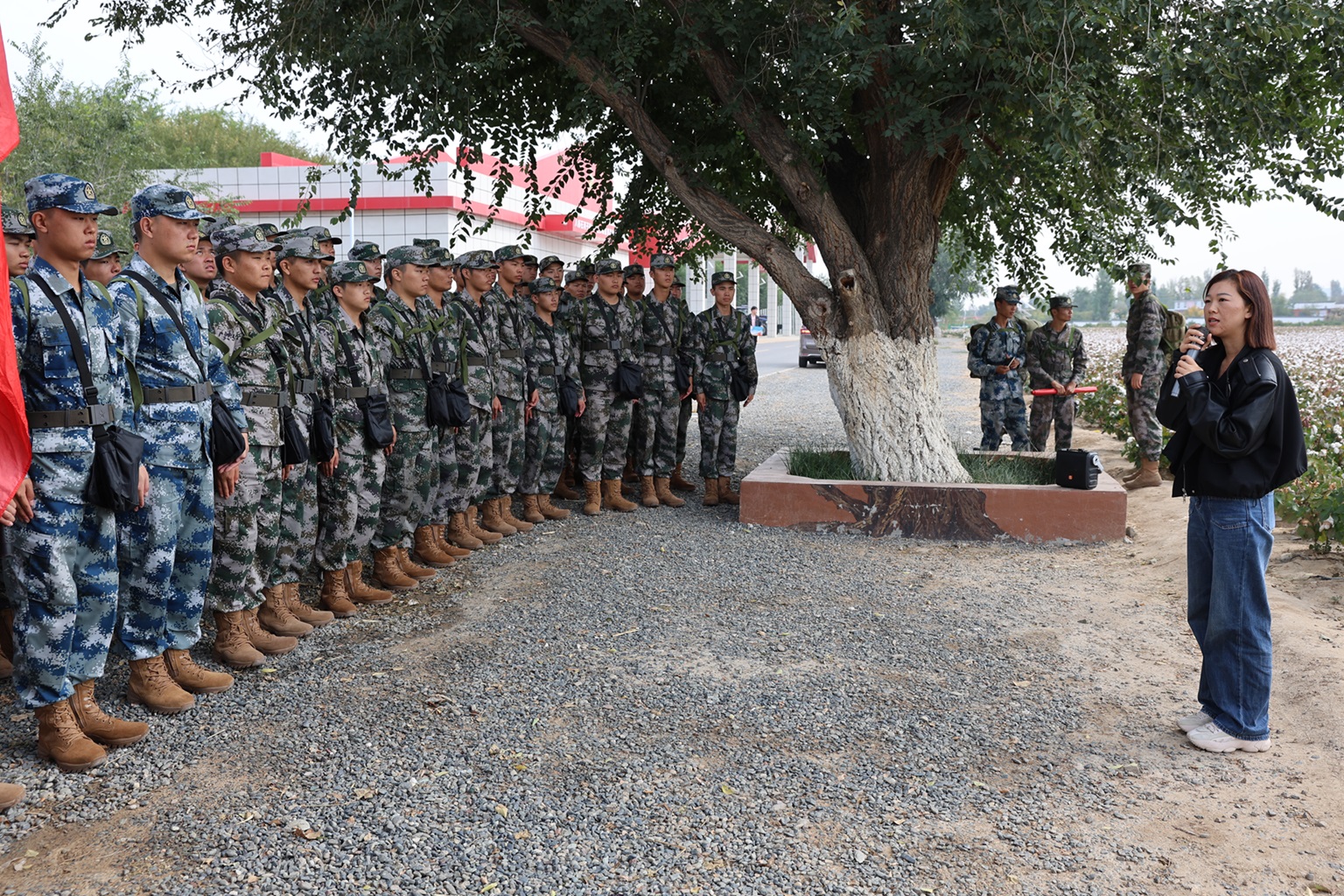 新生们沿着习近平总书记视察石河子的足迹,深刻领会其中蕴含的重大政治意义、历史意义,大家先后前往军垦博物馆——143团1连(棉田)——143团9连(桃园)——团部文化广场边走边听,进行学习观摩。
