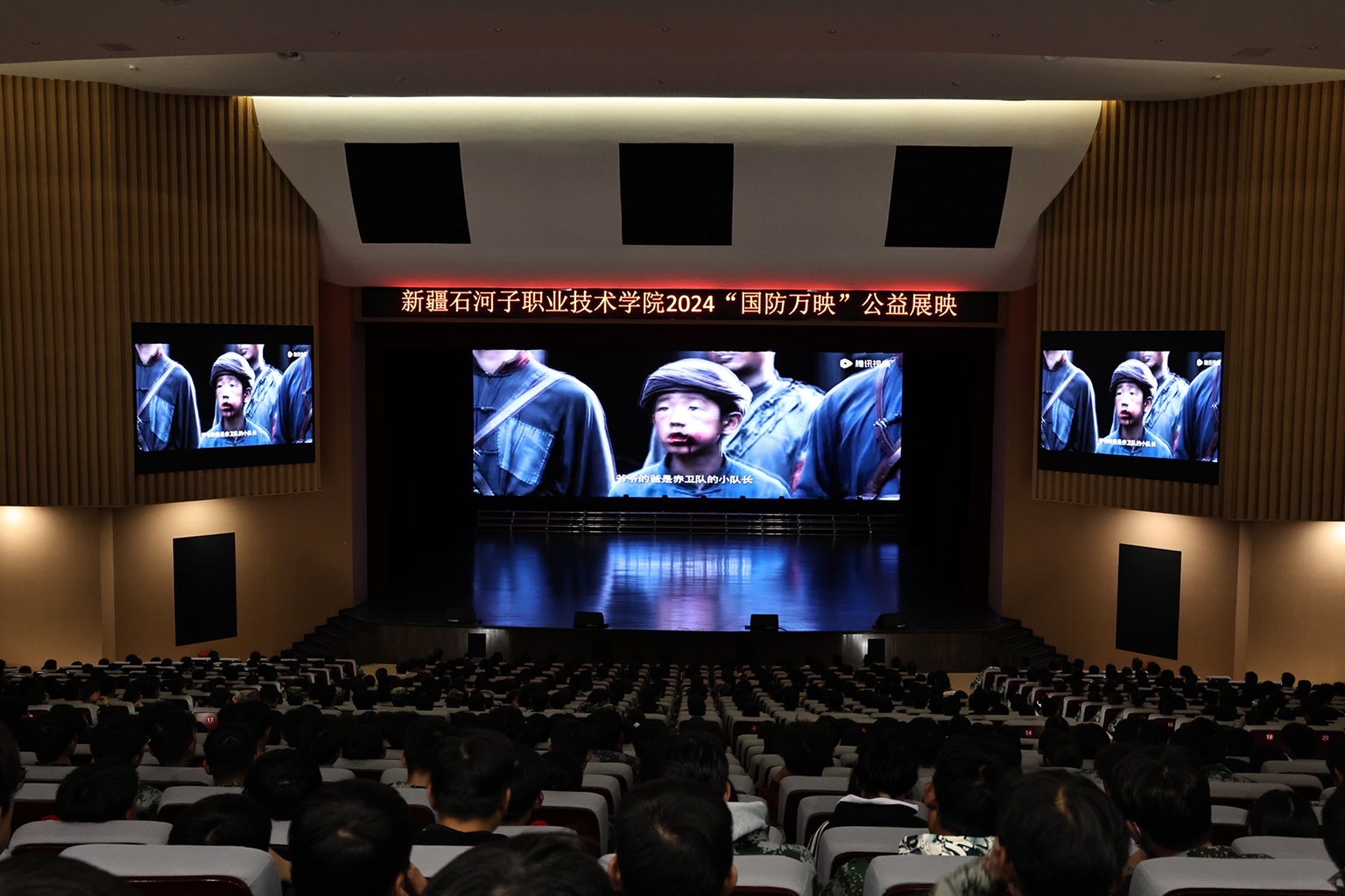 (王需 徐千然 报道)9月27日下午,由学院党委宣传部承办的2024年“国防万映”公益展映活动在学术报告厅举行,各二级学院正在军训的1100名新生参与了活动。“国防万映”公益电影展映活动由兵团党委宣传部会同中国电影基金会在8月-11月组织开展,是中国电影公益活动与全民国防教育的重要品牌项目,成为国防教育的一个重要载体和平台。