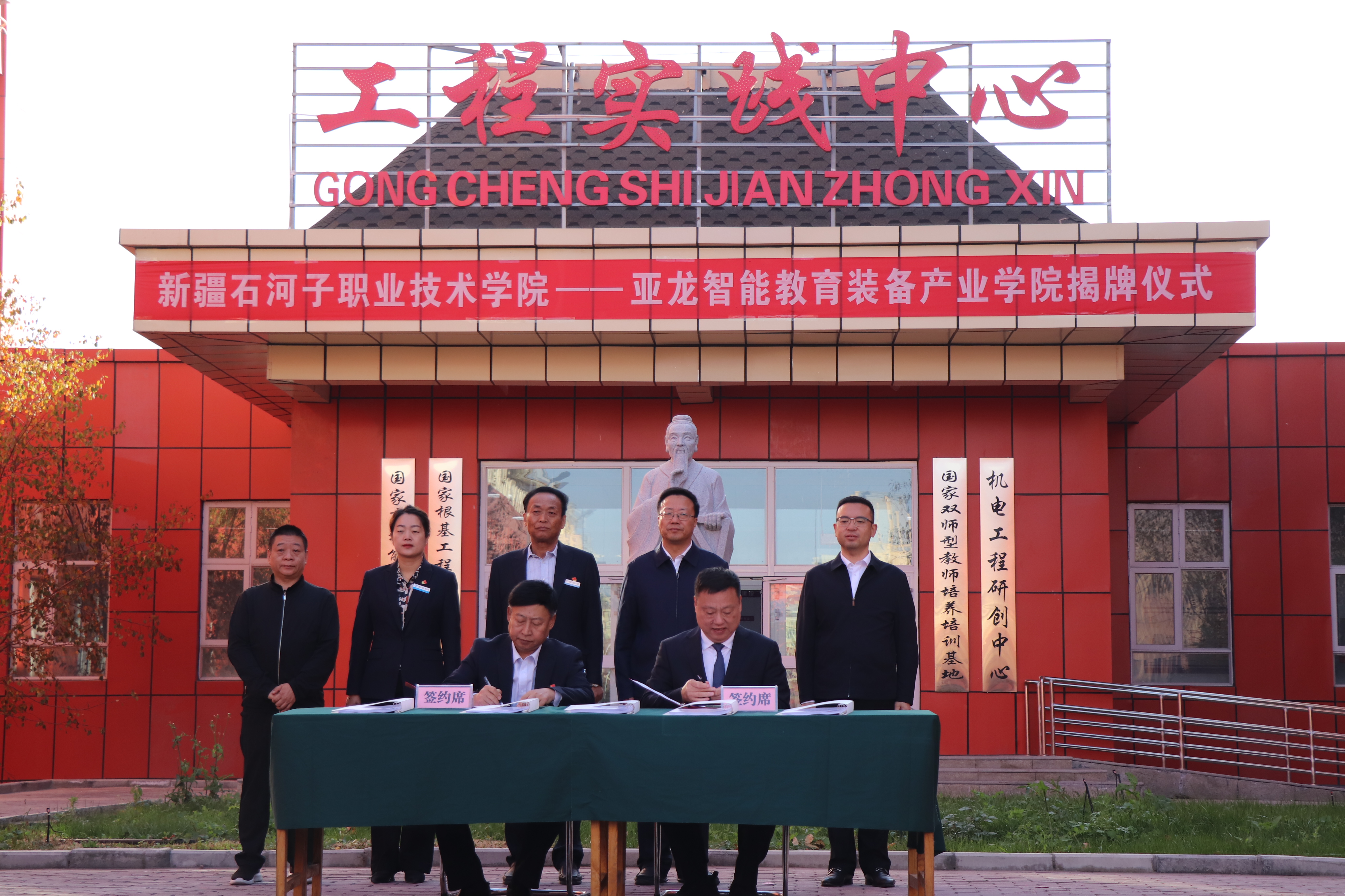 开幕式后,在工程实践中心前,学院与亚龙集团举行了亚龙智能教育装备产业学院揭牌仪式,林炯院长与陈传周总经理签署了《亚龙智能教育装备产业学院合作协议》,宋德忠副师长、黄博书记、史文革书记、陈传周总经理共同为亚龙智能教育装备产业学院及智能制造产教融合示范基地揭牌,标志着学院与亚龙集团在智能教育装备领域开启深入合作。根据双方签订的合作协议,未来双方将在师资培养、产品研发、实习实践等方面开展全方位合作,携手推进智能教育装备产业的创新发展,为社会培养更多优秀的复合型人才。