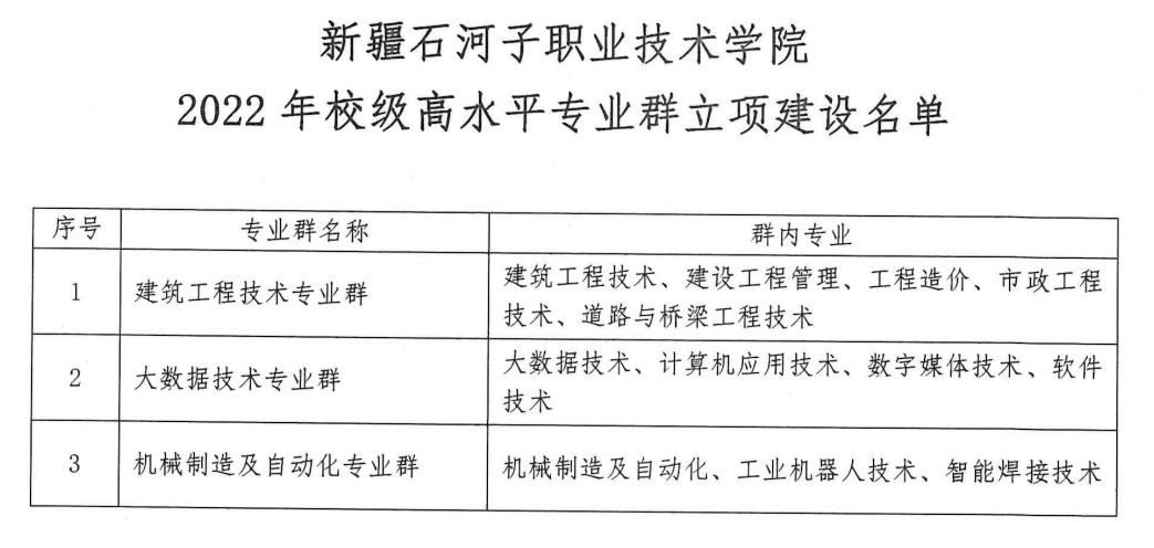 目前,学校内共有校级专业群6个,其中,食品智能加工技术专业群包含食品智能加工技术、食品检验检测技术、食品质量与安全3个专业;应用化工技术专业群包含应用化工技术、硅材料制备技术、环境监测技术、石油化工技术4个专业;电气自动化技术专业群包含电气自动化技术、电力系统自动化技术、建筑智能化工程技术3个专业;建筑工程技术包含建筑工程技术、建设工程管理、工程造价、市政工程技术、道路与桥梁工程技术5个专业;大数据技术专业群包含大数据技术、计算机应用技术、数字媒体技术、软件技术4个专业;机械制造及自动化专业群包含机械制造及自动化、工业机器人技术、智能焊接技术3个专业。