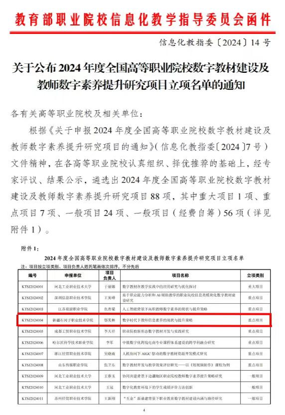 (徐千然 报道)近日,教育部职业院校信息化教学指导委员会公布了2024年度全国高等职业院校数字教材建设及教师数字素养提升研究项目立项名单,beat365唯一官方网站教师邬美林主持申报的课题《数字时代下教师信息素养的现状与提升策略》获准立项重点项目。