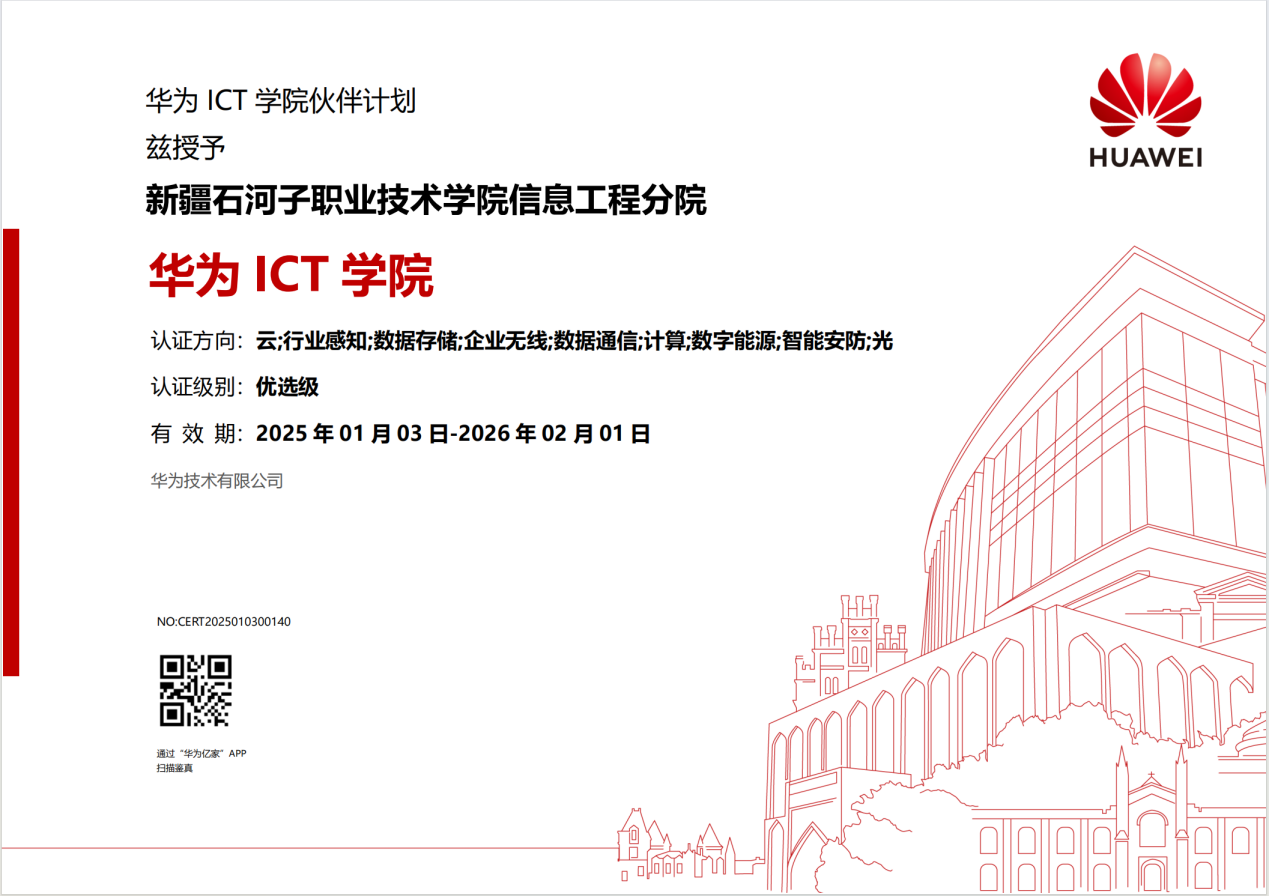(谢元峰 报道)2025年1月3日,beat365唯一官方网站信息与通信工程学院与华为技术有限公司共建华为ICT学院,正式从“认证级华为ICT学院”升级为“优选级华为ICT学院”,成为兵团职业院校中唯一一所获此殊荣的高职院校。这标志着信息与通信工程学院与华为技术有限公司在信息通信技术(ICT)人才培养领域的深度合作取得显著成效,也体现学院的教育教学改革迈上新台阶。