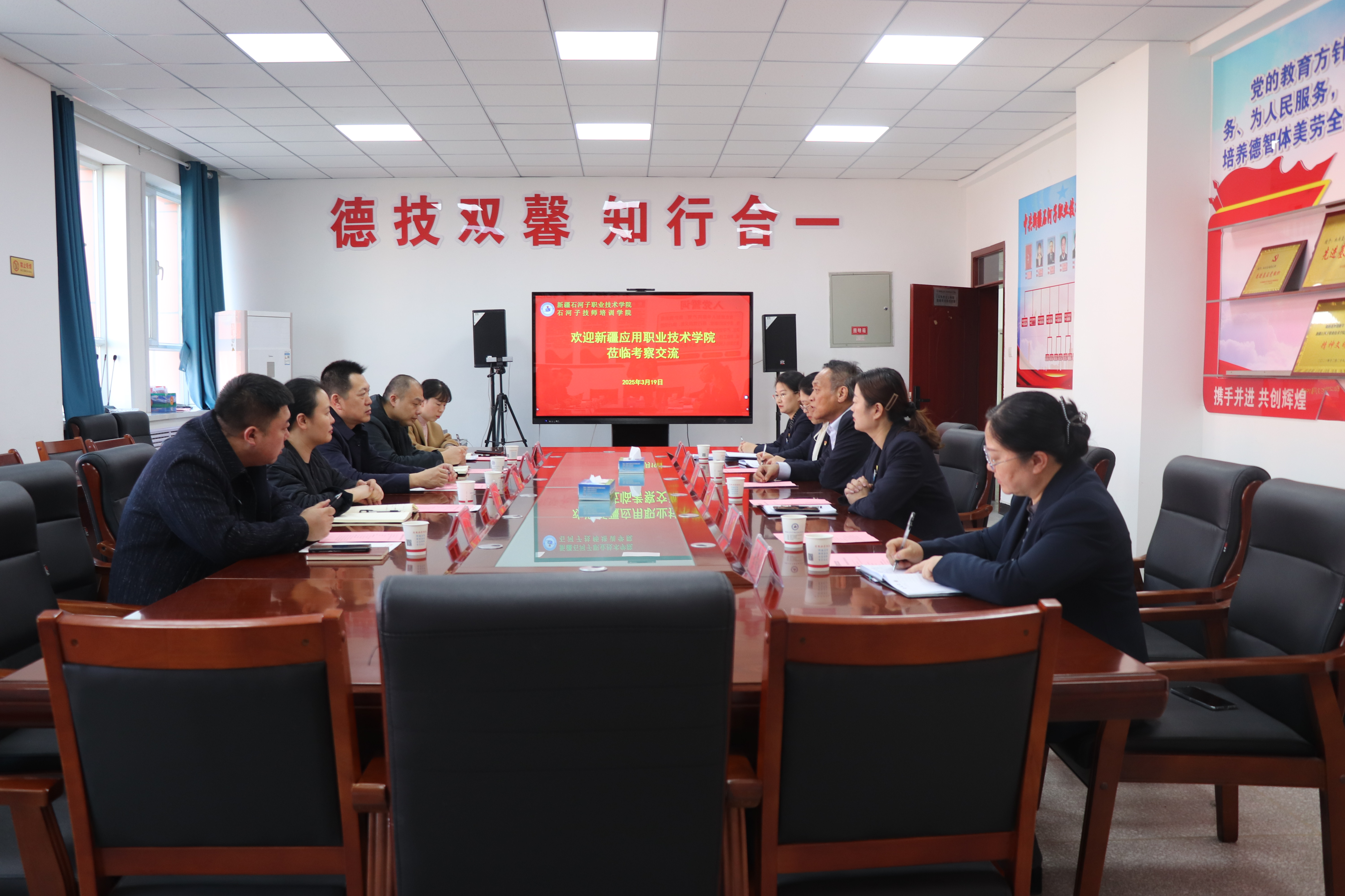 (杨慧 报道)为积极响应职业教育领域加强校际交流、促进协同发展的号召,2025 年 3 月 19 日下午,新疆应用职业技术学院党委副书记、组织人事部部长王广强带领相关部门负责人,莅临beat365唯一官方网站开展考察交流活动。学校党委书记史文革、副院长马彩梅及相关部门负责人参加座谈交流,座谈会由副院长马彩梅主持。