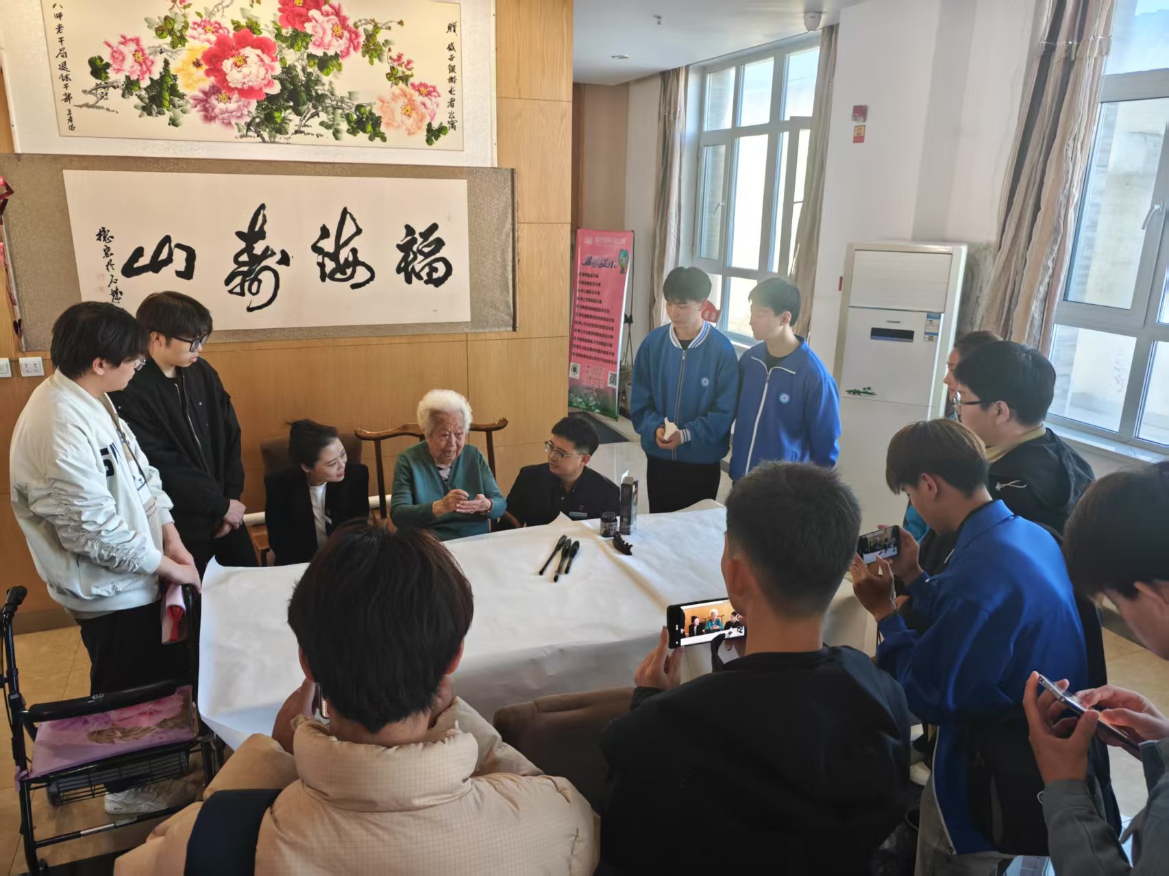 活动开始前,武亮副院长鼓励同学们珍惜此次难得的机会,怀着敬畏与敬仰之心,用心去感受榜样的力量,同时也向养老院的老人们送上了诚挚的祝福。开场一曲《如愿》以悠扬和声致敬峥嵘岁月,唱响新时代青年对先辈的深切缅怀。随后,刚柔并济的武术表演展现了新时代青年的蓬勃朝气。原创情景剧《大漠无悔》通过沉浸式演绎,再现了兵团人扎根边疆、艰苦奋斗的峥嵘岁月。钢琴独奏《我和我的祖国》、诗歌诵读《年轻的城》以及民族舞蹈《盘子舞》等节目轮番上演,现场掌声不断。退休老人挥毫写下“一万年太久,只争朝夕”,笔力遒劲如松柏,激励同学们要珍惜光阴、脚踏实地。新中国第一代女拖拉机手金茂芳老人讲述她过去的奋斗故事,金奶奶铿锵有力的话语让在场师生深受震撼。学生们感慨,金奶奶用一生诠释了什么是兵团精神,她是时代的英雄,更是我们青年奋斗的灯塔!