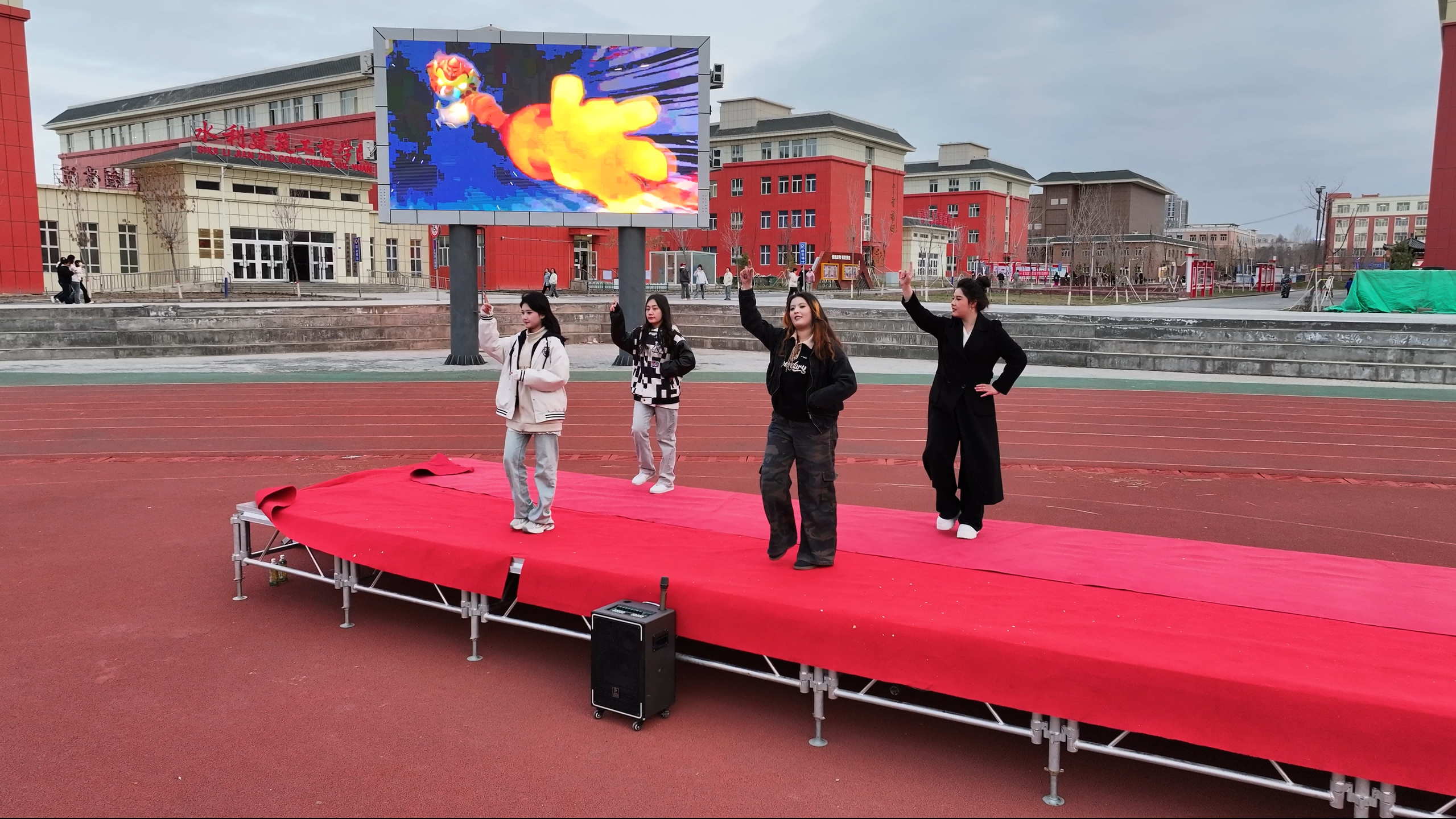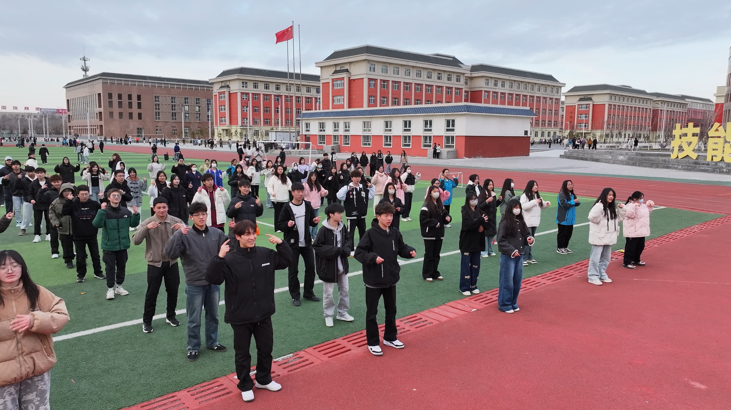 操场上,动感欢快的音乐瞬间点燃现场氛围。领舞同学站在队伍前列,带领大家踏入这场活力四溢的广场舞盛宴。大学生艺术团精心编排的《APT》《嗨,巴郎仔》等舞蹈,融合流行与民族元素,节奏动感且动作易学。同学们紧跟领舞节奏,尽情舒展身姿,在音乐与舞步中畅享运动快乐,现场满是青春跃动的身影。