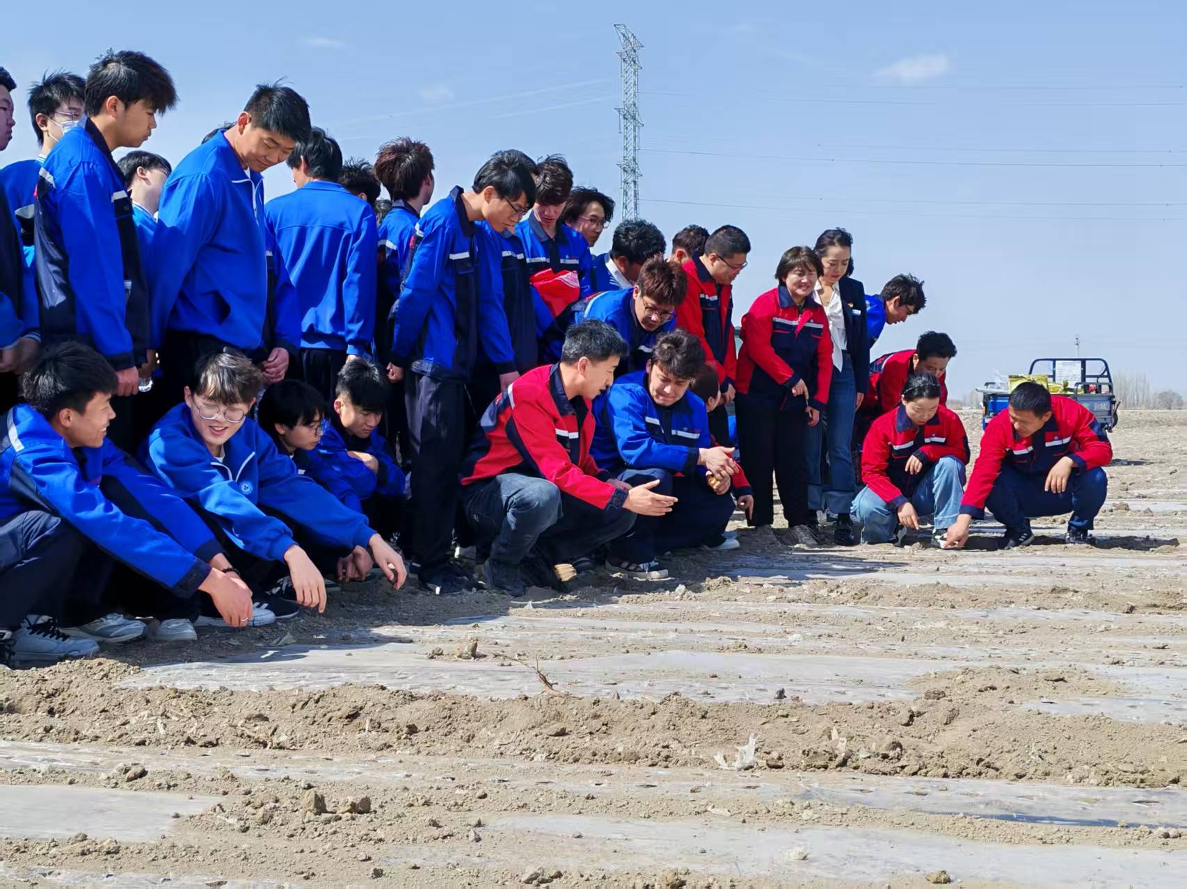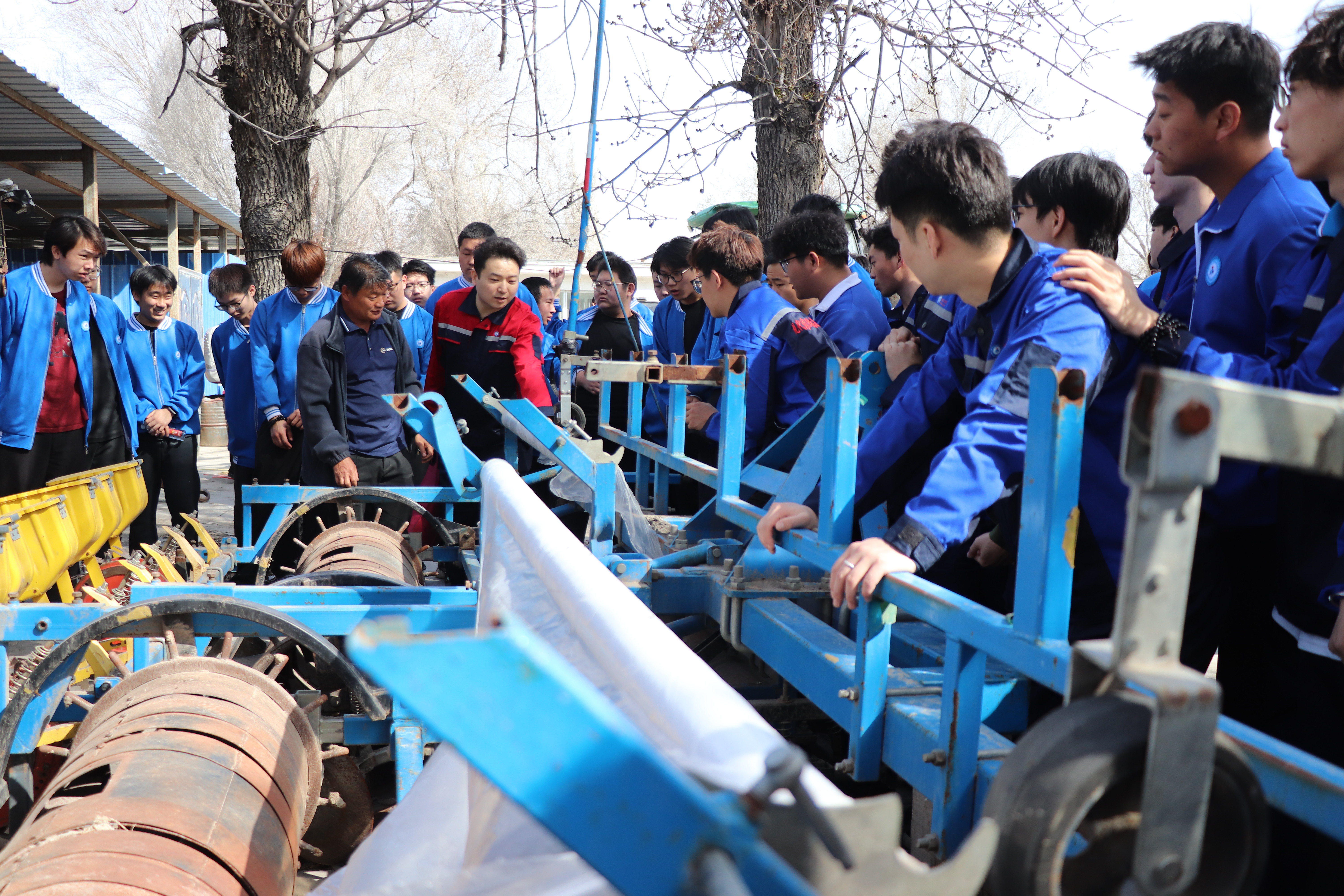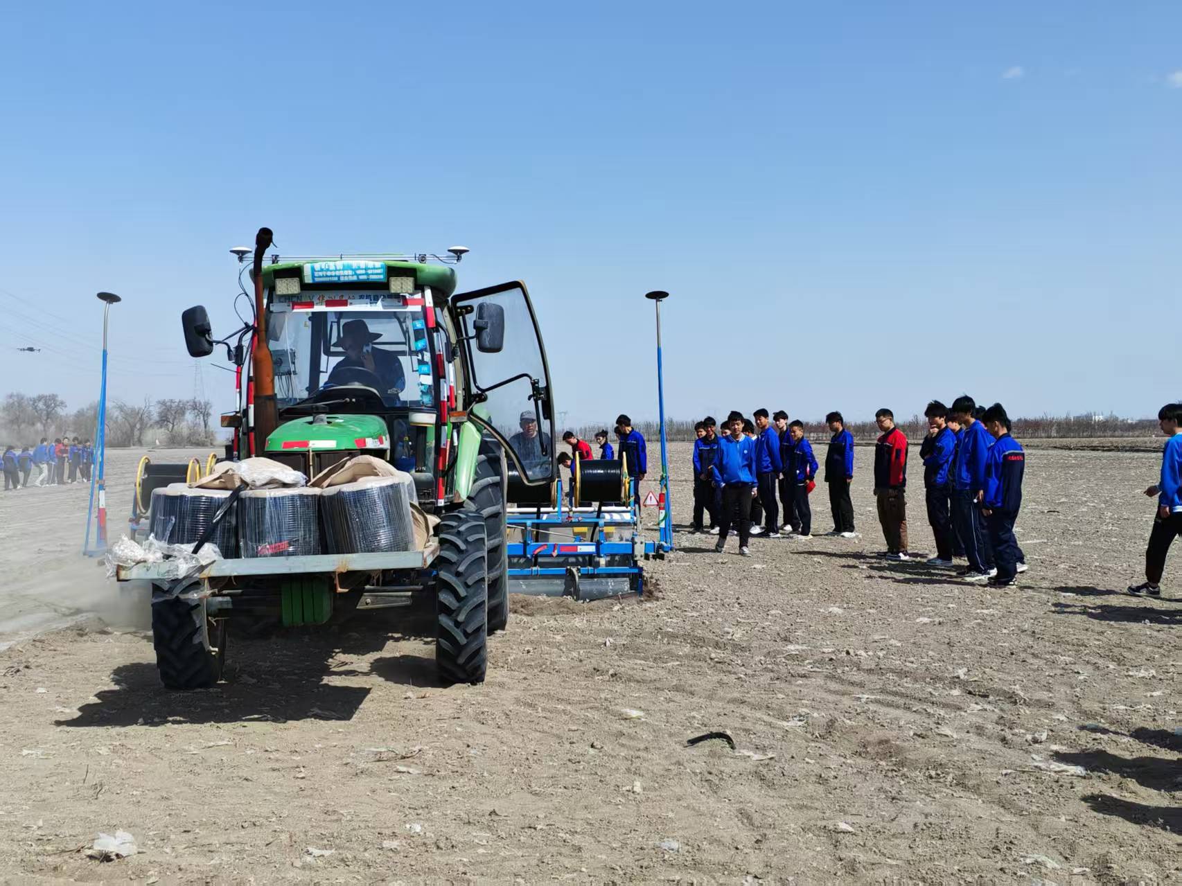 在双泉集三连连部大院,学院教师刘志明为在场人员详细讲解了“导航在播种作用中的应用及调试”。新疆域昇肥业有限公司总经理周静分享植保技术经验,提到公司在学院老师指导下,与科研机构合作取得15个实用新型专利证书,并表明此次活动将为农户带来先进植保知识与优质肥料。三连技术员刘洪及学院教师联合开展播种机调试实践培训,他们从操作安全规范到调试技巧进行手把手传授,指导学生如何对播种机进行精准调试,让学生们在实践中不断积累经验、提升技能。在正在播种的棉田地里,学院教师化身田间导师,结合实际播种情况,生动阐释播种深度、行距控制等关键要点,让学生深切领悟理论知识与生产实践的紧密关联,为未来投身农业现代化建设筑牢根基。