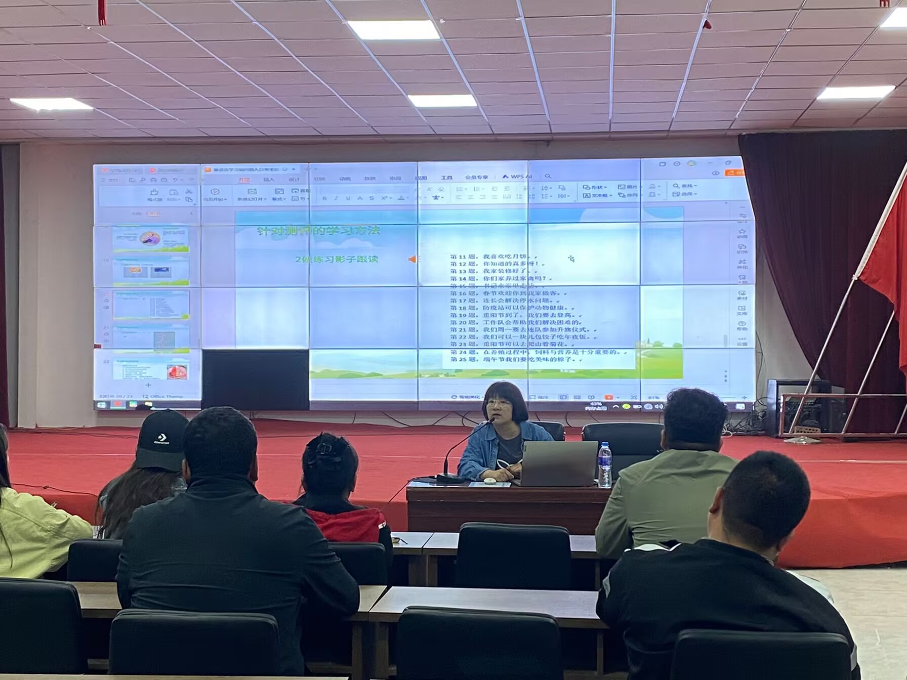 刘佳老师针对职工群众学习过程中存在的难点,作了题为《学习方法指导》的讲座,提出了实用的解决方案。在词汇学习方面,建议从生活中挖掘元素,推普工作者与职工共同制作词卡,开展多样的互动活动,提高职工的听力和词汇识别能力,增强学习乐趣。丁治维老师面向连队普通话推广工作者,作了题为《青壮年劳动力国家通用语言能力测评方法与技巧》的讲座,详细讲解了测评标准和评分等级,使在场人员对评测体系有了更深入地理解。