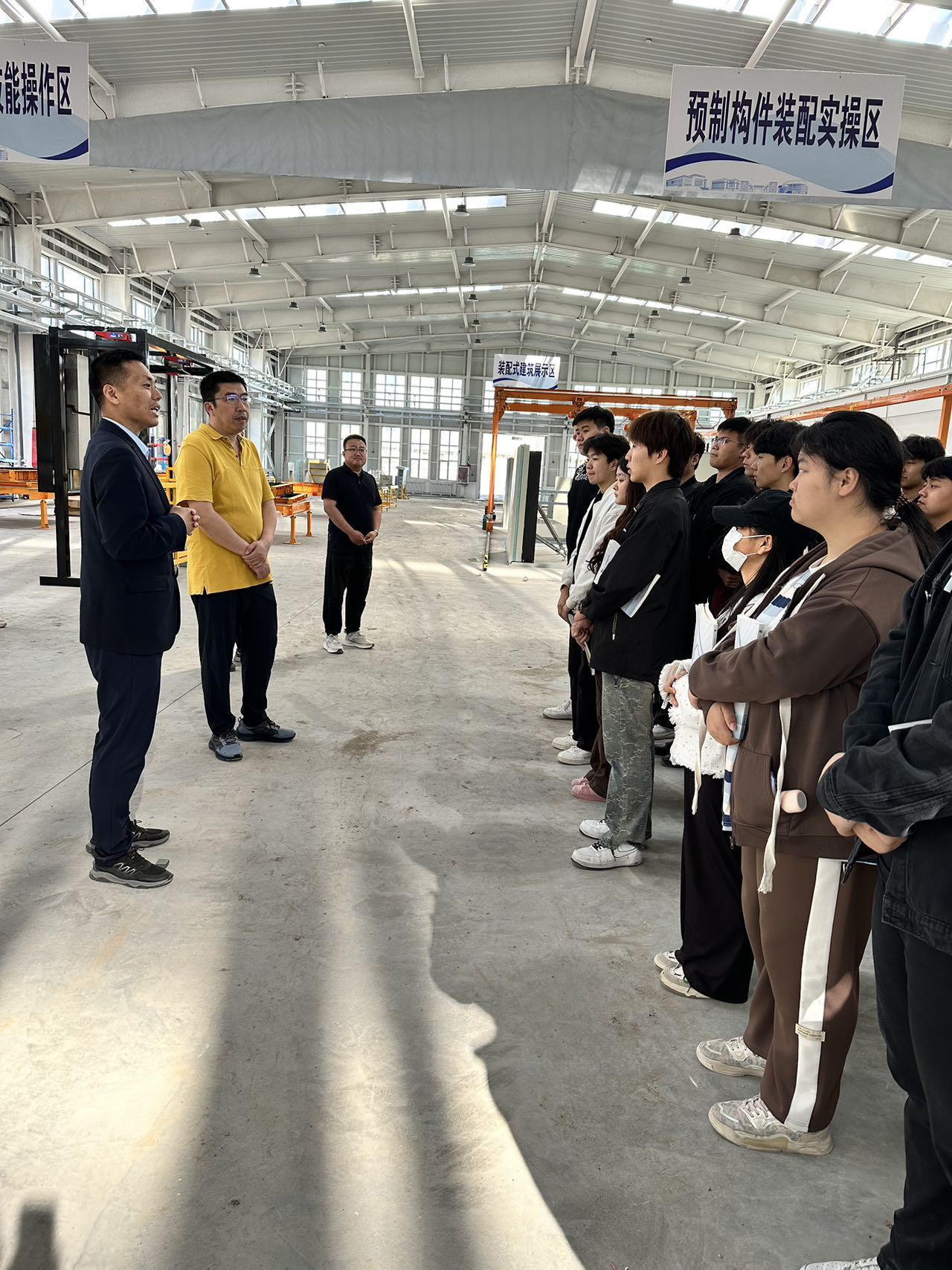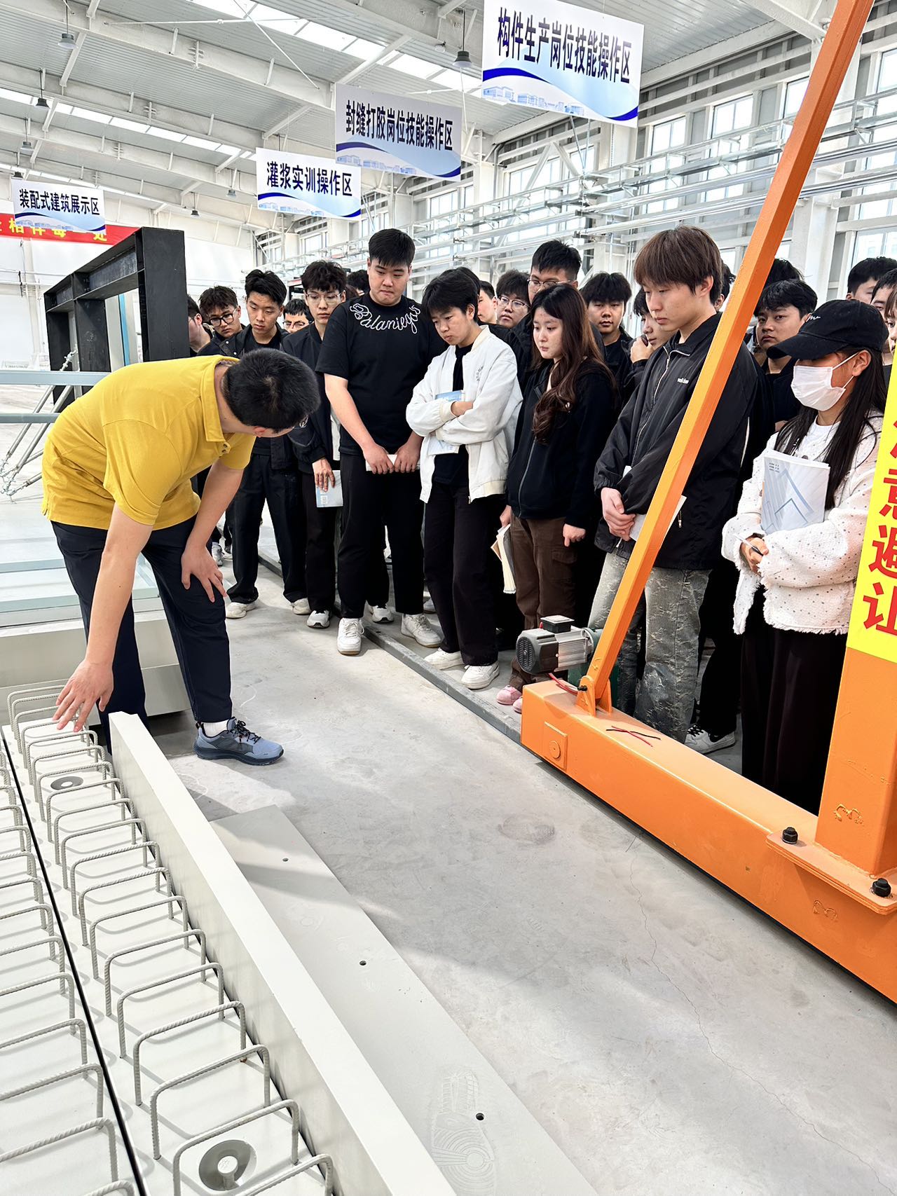 刘镇教授以装配式建筑预制构件为教学案例,结合我国《“十四五”建筑业发展规划》中关于推动智能建造、绿色低碳转型的政策要求,系统解析了装配式建筑“设计—生产—施工”全链条的技术优势。在施工现场,师生实地观摩了叠合板安装工艺,并分组对构件拼缝精度进行测量分析。通过触摸螺栓连接节点、参与施工模拟操作,学生们直观理解了装配式建筑“干法作业”的核心特点。一名参与活动的学生表示:“观察构件拼接细节,让我对课堂理论有了更深刻的认识,也感受到技术创新对行业升级的推动力。”刘春晓副院长指出跨校实践教学对深化产教融合的意义,表示希望通过与合作院校联合开展实践教学,为学生提供更多对接行业前沿的实践平台。