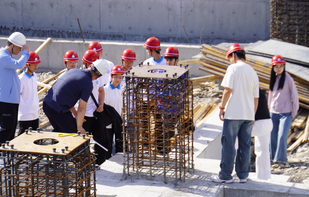 张婷院长在实践活动动员讲话中强调安全生产的重要性,要求学生提升自身安全意识,做好安全防范。学院特别设置岗前安全实训模块,通过虚拟仿真系统预演施工场景风险点,确保实践活动安全有序开展。在教师与工程师团队引导下,学生分组深入施工作业面,在混凝土浇筑区,师生共同计算建筑使用寿命与社会效益的关联公式;在智能建造展示区,数字化施工系统引发学生的深度思辨。实践教学中,教师以“中国建造”发展历程为脉络,解析技术革新背后的奋斗精神。学生们纷纷表示,自己在精密构件拼接过程中,既感受到科技力量,更体会到“螺丝钉精神”的时代价值。在工程现场微课题教学环节,学生团队针对施工组织设计、材料损耗控制等实际问题,在教师指导下完成优化方案,有效提升了学生解决复杂工程问题的能力。