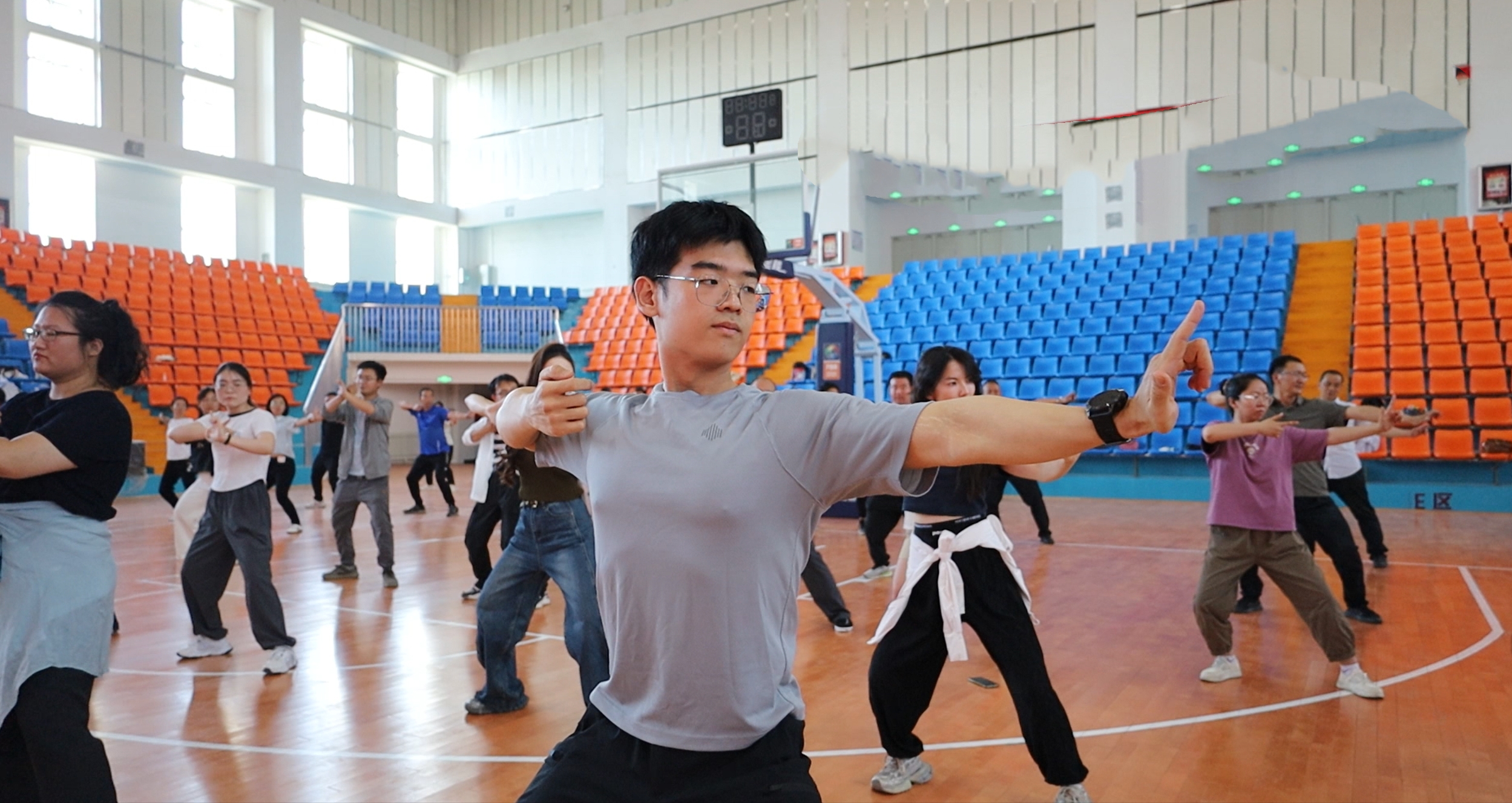 (张宇 报道)2025年5月21日傍晚,暮色渐浓,华灯初上,beat365唯一官方网站体育馆内,“惠工暖心”工程——“健康惠民・八段锦养”普惠培训正式启动。石河子太极拳协会主席、国家一级裁判员、健身气功国家级指导员刘春英受邀担任教练,带领学院150余名教职工开启传统养生功法学习之旅。