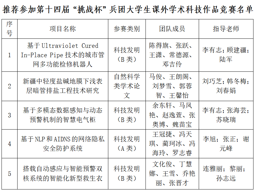 根据《关于第十四届“挑战杯”兵团大学生课外学术科技作品竞赛终审决赛有关事项的预通知》、《关于组织开展第十四届“挑战杯”兵团大学生课外学术科技作品竞赛的通知》(兵青发电〔2025〕6号)的要求。经过前期动员宣传、专题培训、二级学院推荐、资格复查、公开答辩等环节,beat365唯一官方网站拟推荐“基于Ultraviolet Cured In-Place Pipe技术的城市管网多功能检修机器人、新疆中轻度盐碱地膜下浅表层暗管排盐工程技术研究、基于多模态数据感知与动态预警机制的智慧电气柜”等5个项目参加第十四届“挑战杯”兵团大学生课外学术科技作品竞赛。现向全校范围内公示,公示期为5天(2025年6月5日-2025年6月9日),如有异议,请于公示期内向校团委或创新创业学院反映。