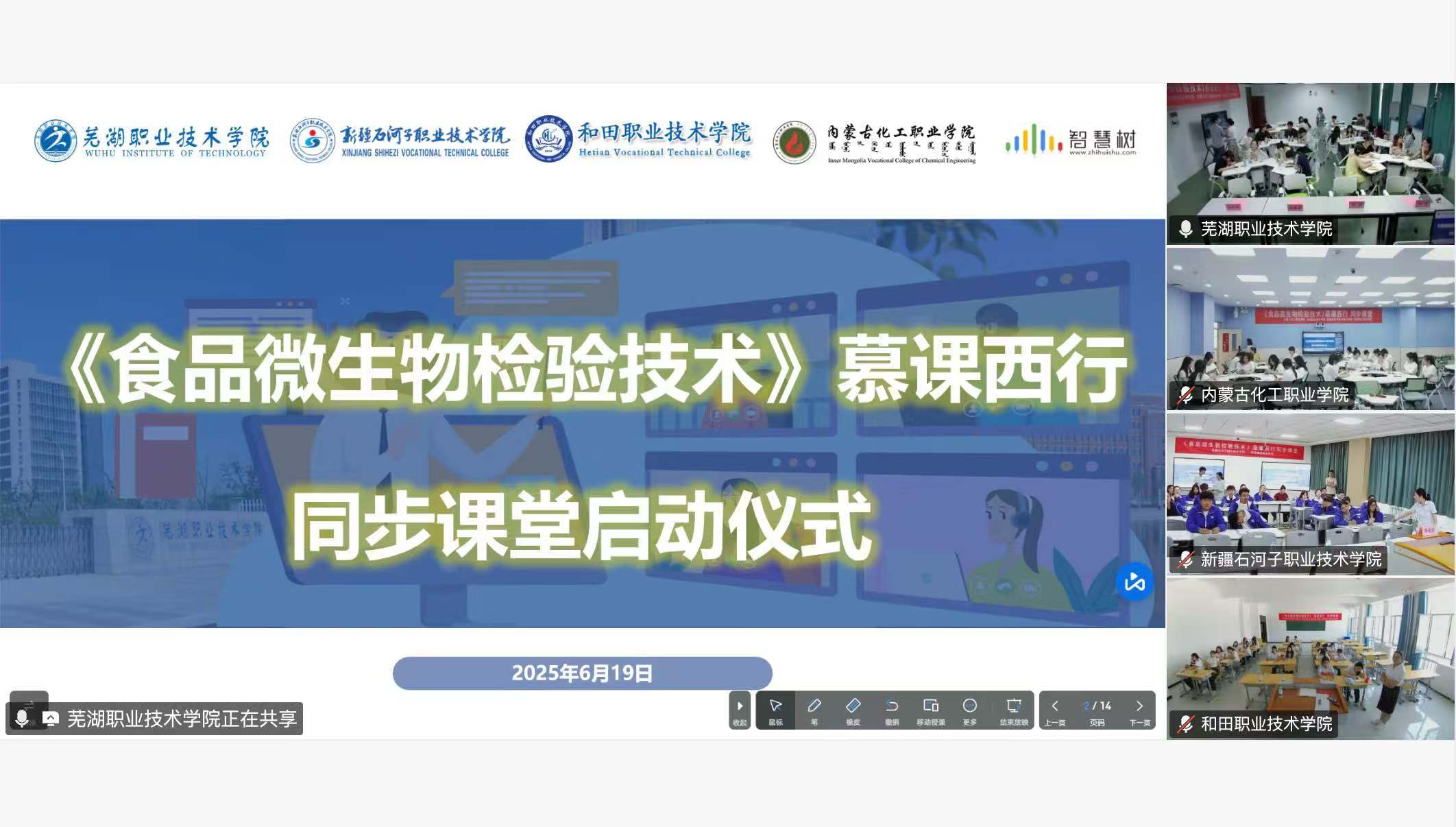 (年国芳 报道)为积极响应教育部高等教育司“慕课西行2.0”行动号召,进一步加深东西部高职院校合作,推动优质教育资源的互联共享和教学改革创新。2025年6月19日,beat365唯一官方网站与芜湖职业技术学院、和田职业技术学院及内蒙古化工职业技术学院共同开展“慕课西行—同步课堂”启动仪式暨系列教学活动。学校党委委员、纪委书记万祥军,芜湖职业技术学院党委委员、副校长季慕寅,各学校相关领导及100余名师生参加教学活动。