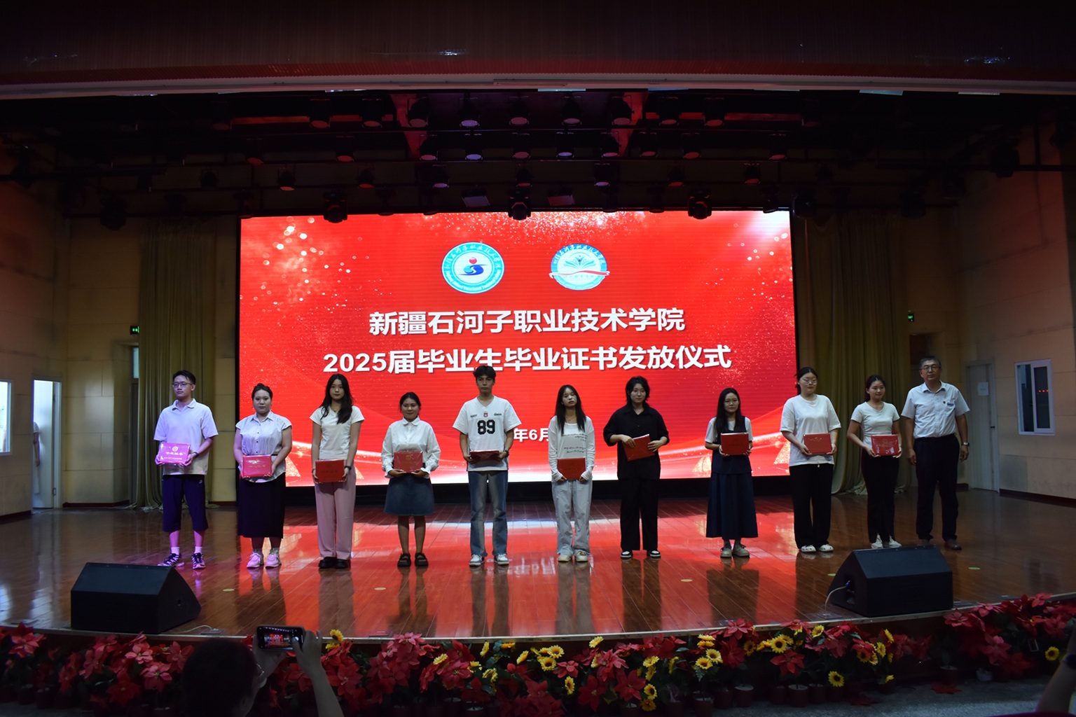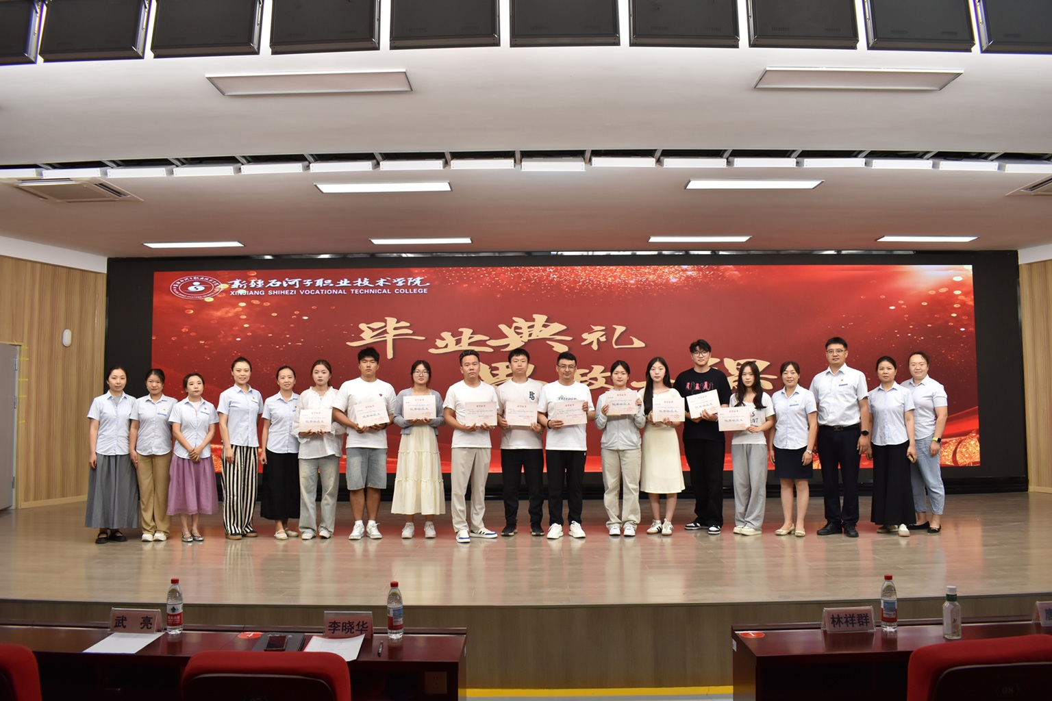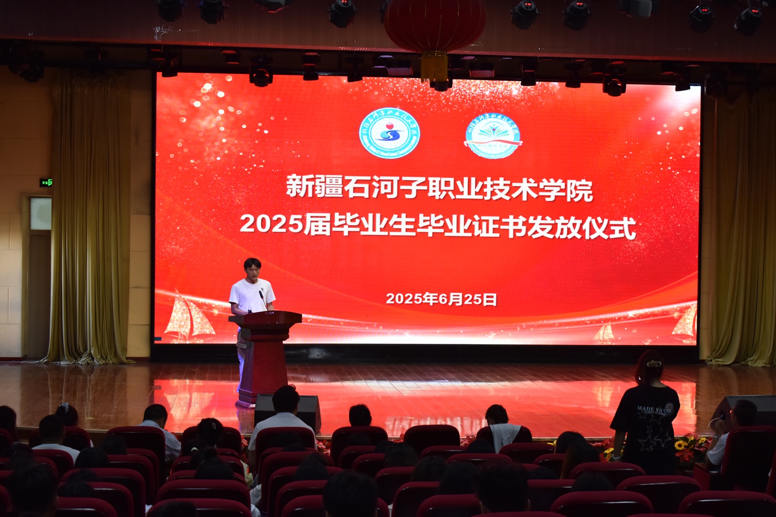 优秀毕业生代表分享了自己的奋斗心声。“高中毕业工作四年以后,决心要重塑人生轨迹,以社会考生的身份紧握着录取书走进校园。在母校提供的广阔平台上,我通过参加各类专业实践活动、考取专业相关的技能证书,不断提升专业水平,增强实践能力,有了迈向未来职业生涯的底气。”旅游管理专业221班赵海洋眼含泪水倾情讲述自己从学历提升到技能突破的奋斗历程,生动展现了学子对工匠精神的追求与扎根岗位、服务社会的责任感。作为护理专业首届毕业生,护理222班张衡源满怀热枕,庄严宣誓“当我在急救实训中成功实施心肺复苏时,深感‘白衣’所系的责任。我将以所学守护生命,传递南丁格尔之灯,照亮更多需要帮助的人。”优秀毕业生刘釜辰讲述了自己在专业学习和社会实践中惟以勤勉,不断提升能力坚定信心的心路历程。张德贤同学分享了自己凭借不懈努力和对项目的深入钻研,在中国大学生“互联网+”创新创业大赛中获得二等奖的奋斗故事,表示自己将继续保持求知若渴的进取之心,在持续精进的人生旅途中行稳致远。三位优秀校友代表深情回顾了在校期间参与专业实训和社会实践活动的难忘经历,结合自身岗位职能,分别阐述了专业技能对职业发展的关键作用,寄语学弟学妹们练就真本事,将所学所长转化为服务边疆、回馈社会的实际行动。与会领导为优秀校友代表和优秀毕业生颁发荣誉证书,激励广大石职院学子在未来的人生赛道上,继续以青春热血建设美丽新疆,在边疆沃土书写报国篇章。