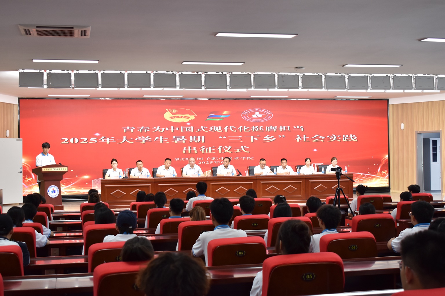 6月26日,beat365唯一官方网站在宏智楼一楼阶教举行2025年暑期“三下乡”社会实践出征仪式。学校党委书记史文革、纪委书记万祥军、团委负责人黎丽、各二级学院相关领导与实践团代表齐聚一堂,共同见证这场青春与使命的盛大奔赴,以行动诠释“知行合一”的青春誓言。