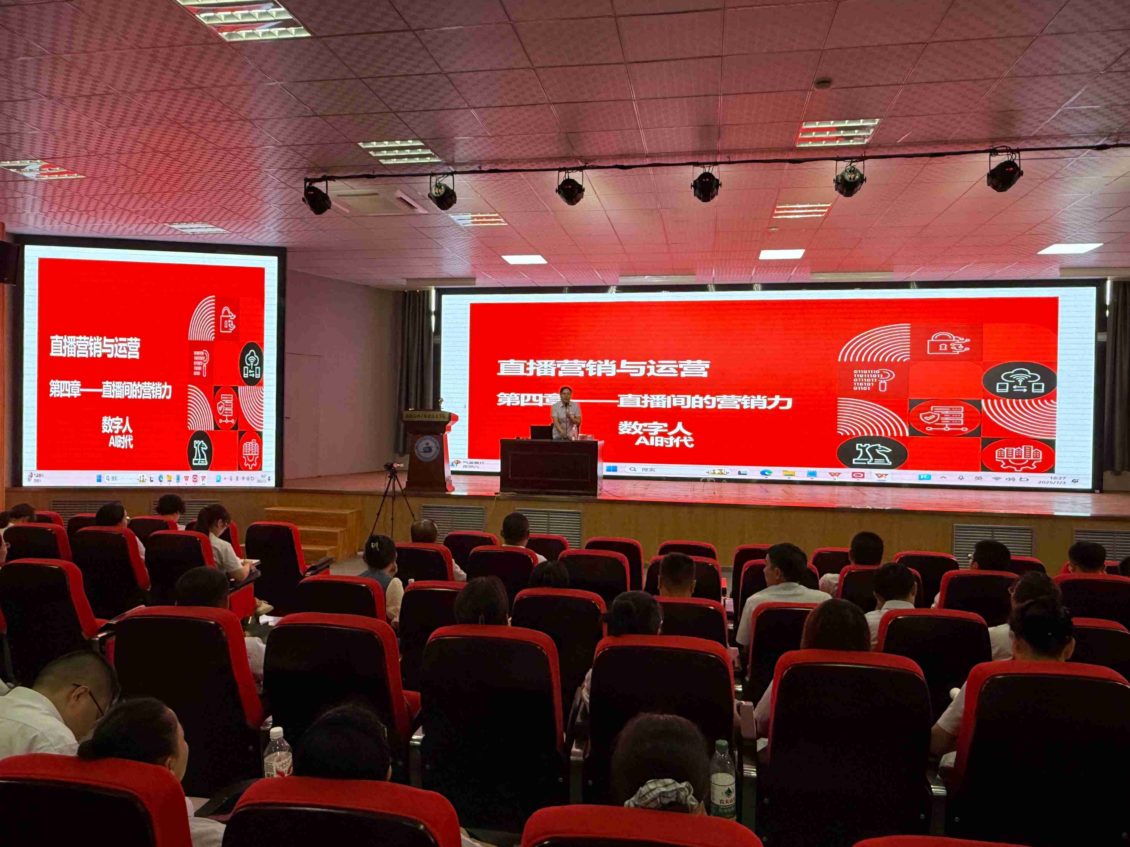 此次培训紧密结合学院实际情况,分三阶段有序开展,分别为全体教师集中培训、实验实训室仪器设备使用培训及进企业实践。集中培训紧扣教育教学实际需求,内容精准聚焦核心能力建设,设置了“师德师风培训”“强化网络安全意识筑牢网络安全防线”“公开课展示:《直播电商——数字人直播》”“学生管理”“校园法治安全培训”“职业本科的管理转型”“人工智能在教育教学中的应用”等专题。培训内容兼具前沿性与实用性,现场学习氛围十分浓厚。