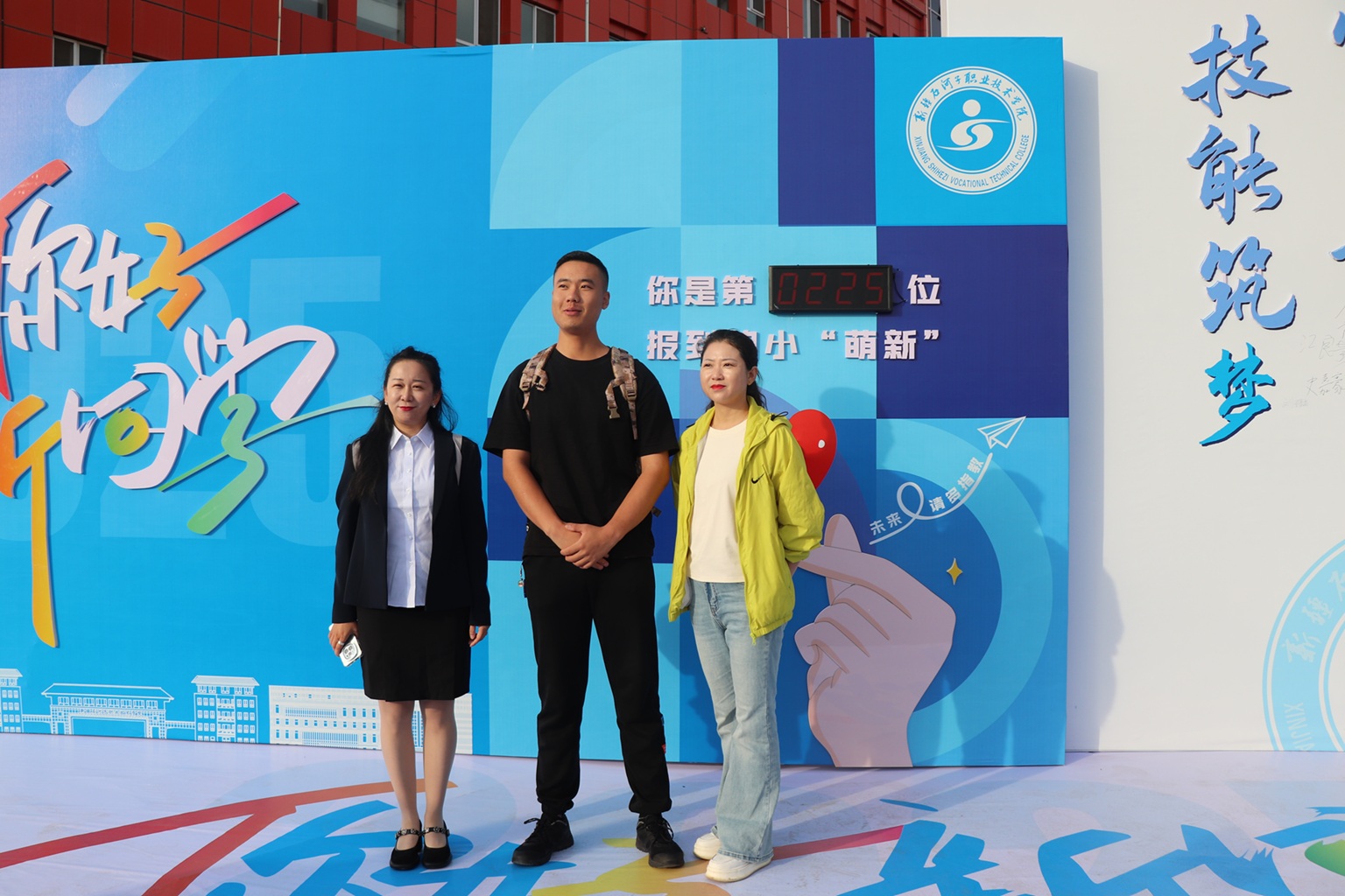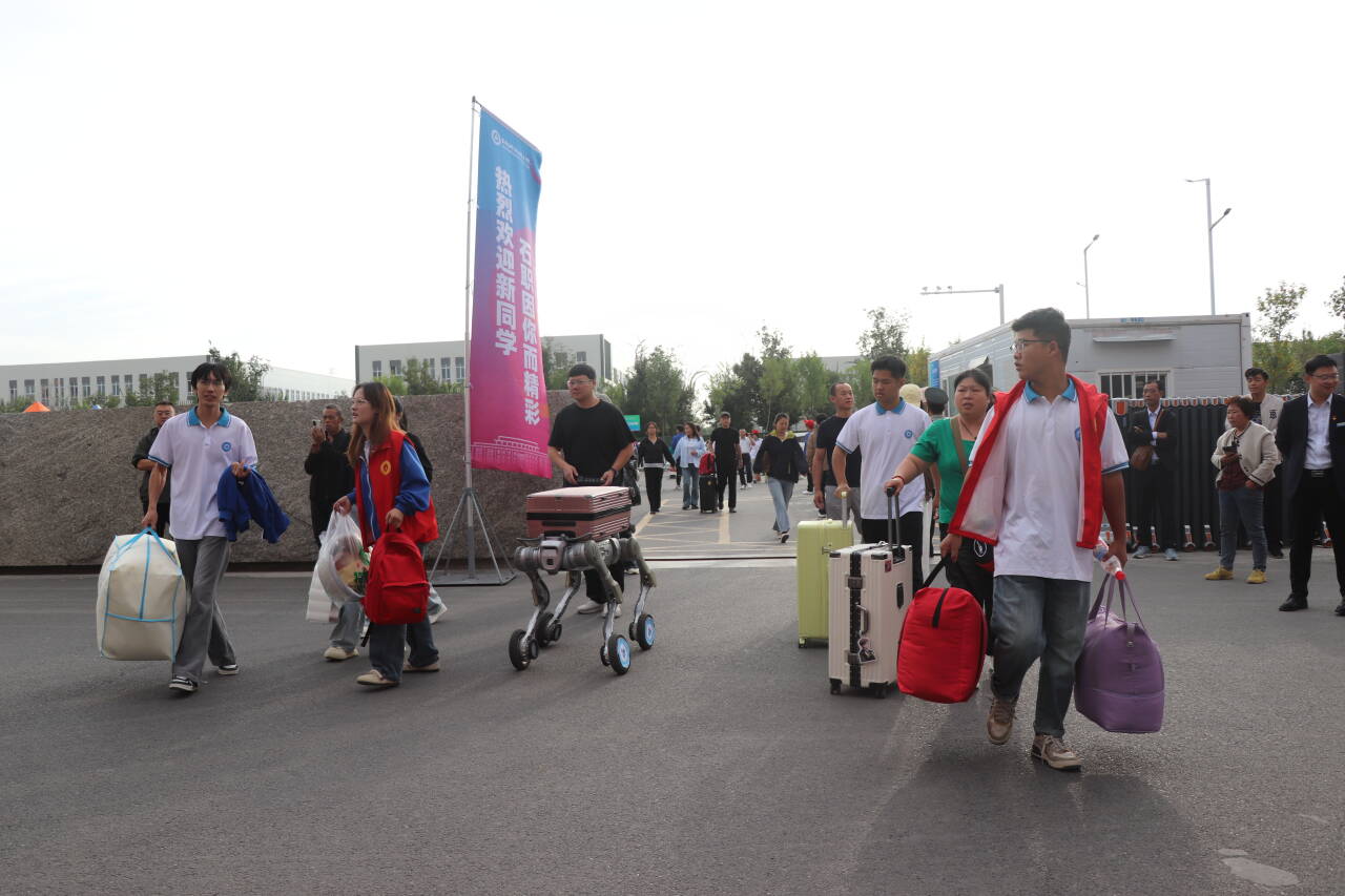 科技元素是本届迎新活动的一大亮点。报到现场,智能设备全程“在线”:身形小巧却力量十足的配送机器人精准对接行李,安全运到宿舍;机器人“管家”热情地与新生及家长打招呼、互动,以欢快的语音送上祝福;憨态可掬的机器狗表演倒立、跳跃、握手等动作,科技感扑面而来。“你是第2658名报到的‘小萌新’”——报到墙上的电子计数器清晰记录着每一位新生的到来。