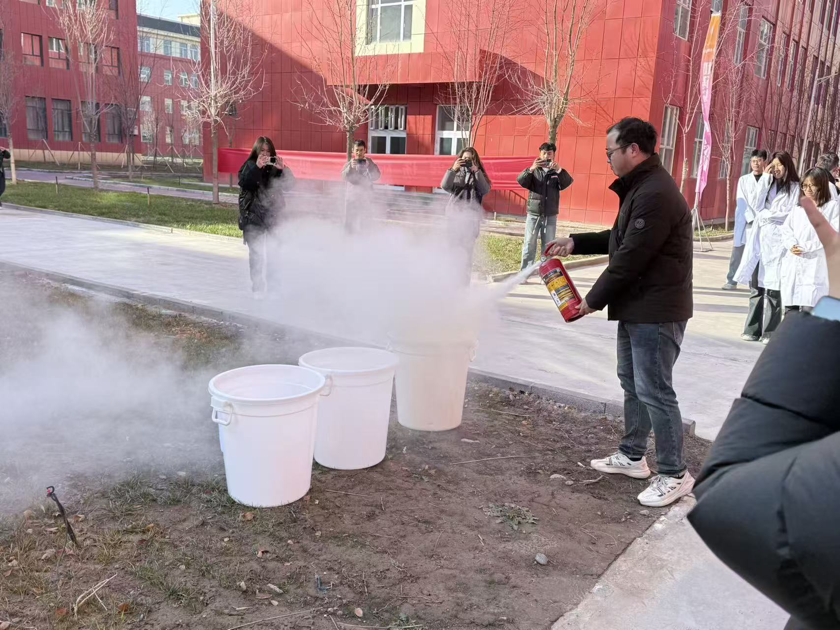 上午11时40分,随着模拟“火灾”警报响起,消防演练正式启动。学生迅速响应,用衣物捂口鼻、弯腰低姿沿预定路线有序撤离。各楼层疏散引导员手持扩音喇叭,在各安全出口实时引导,保障通道畅通。两个班级102名学生迅速抵达楼外集结区,班长清点人数后向学院安全管理负责人汇报,确认人员无遗漏、受伤情况,整个演练过程规范有序。在消防器材实操环节,校外消防人员向师生们讲解吸入烟尘后的急救方法,结合专业实训特点强调易燃试剂存放、设备电源关闭等安全要点,并现场演示灭火器“提、拔、握、压”操作步骤,指导学生代表实操练习,确保学生掌握应急设备使用方法。
