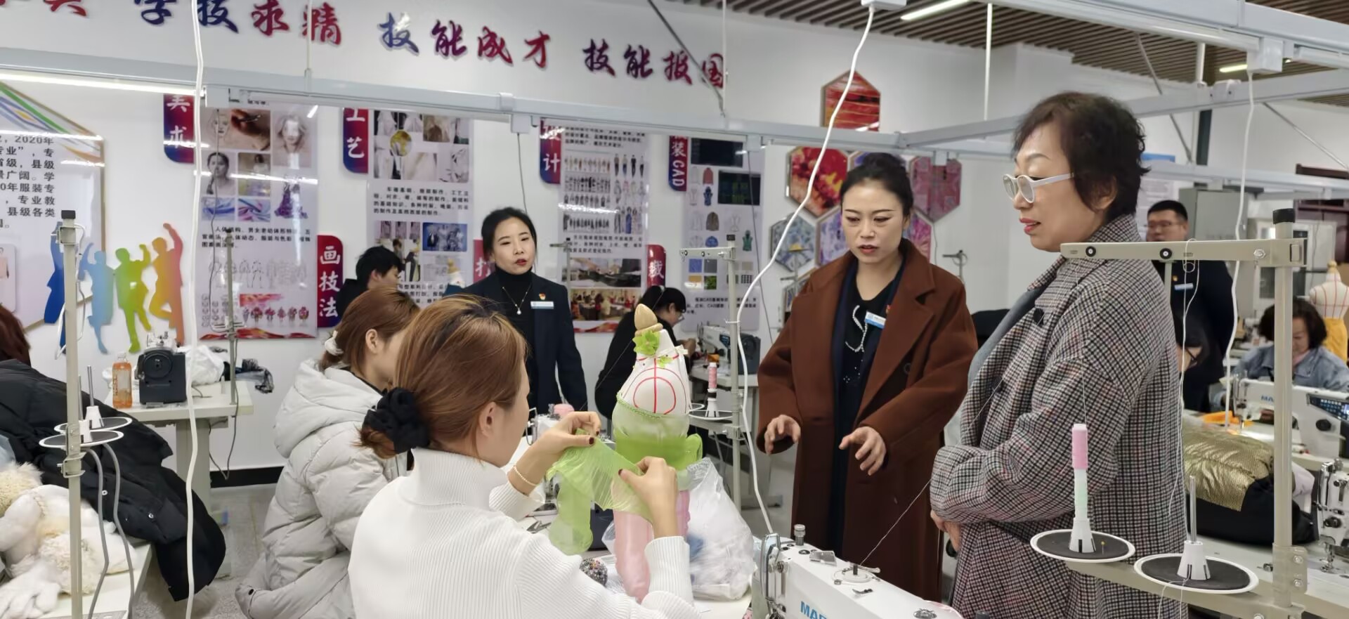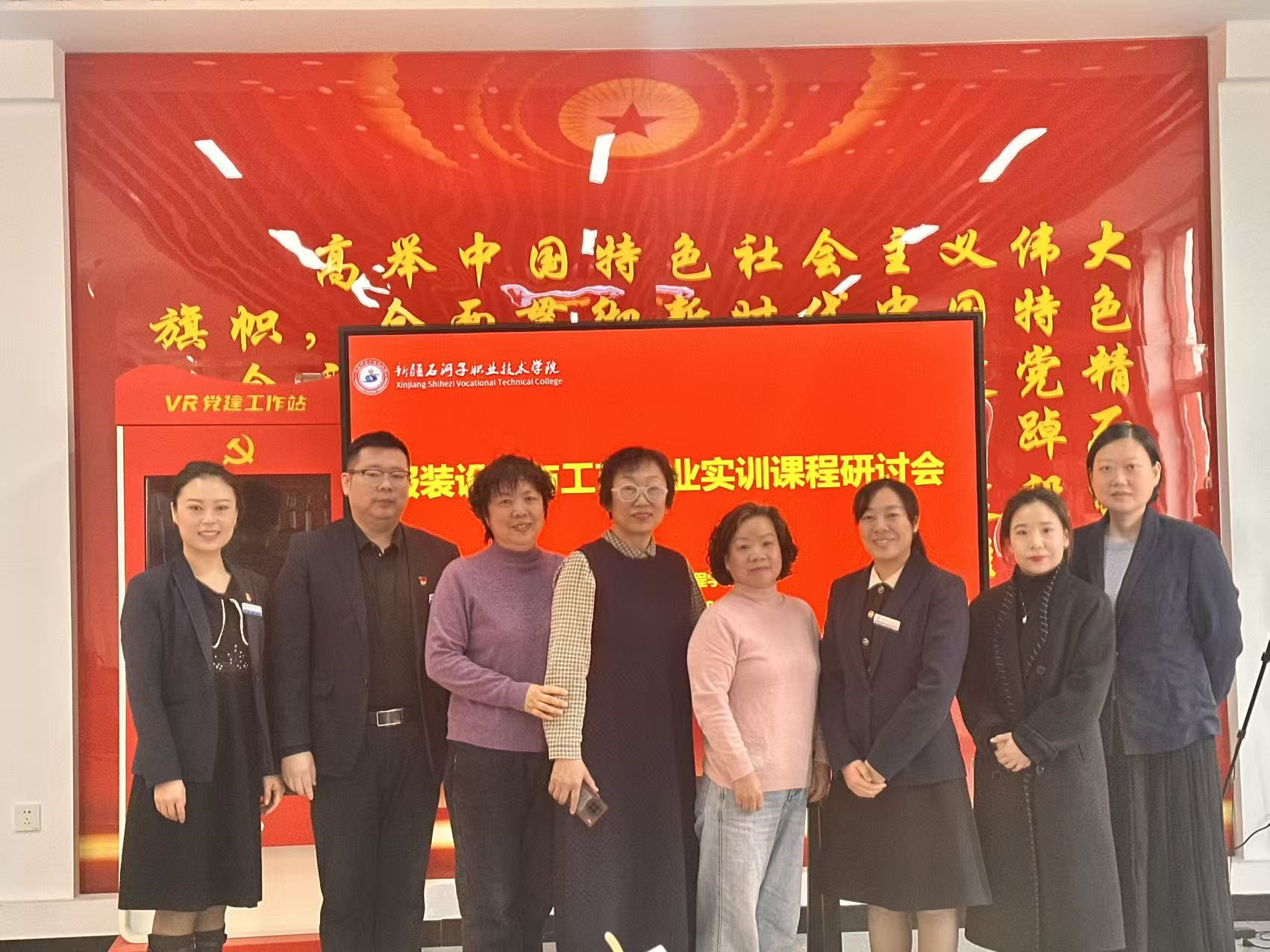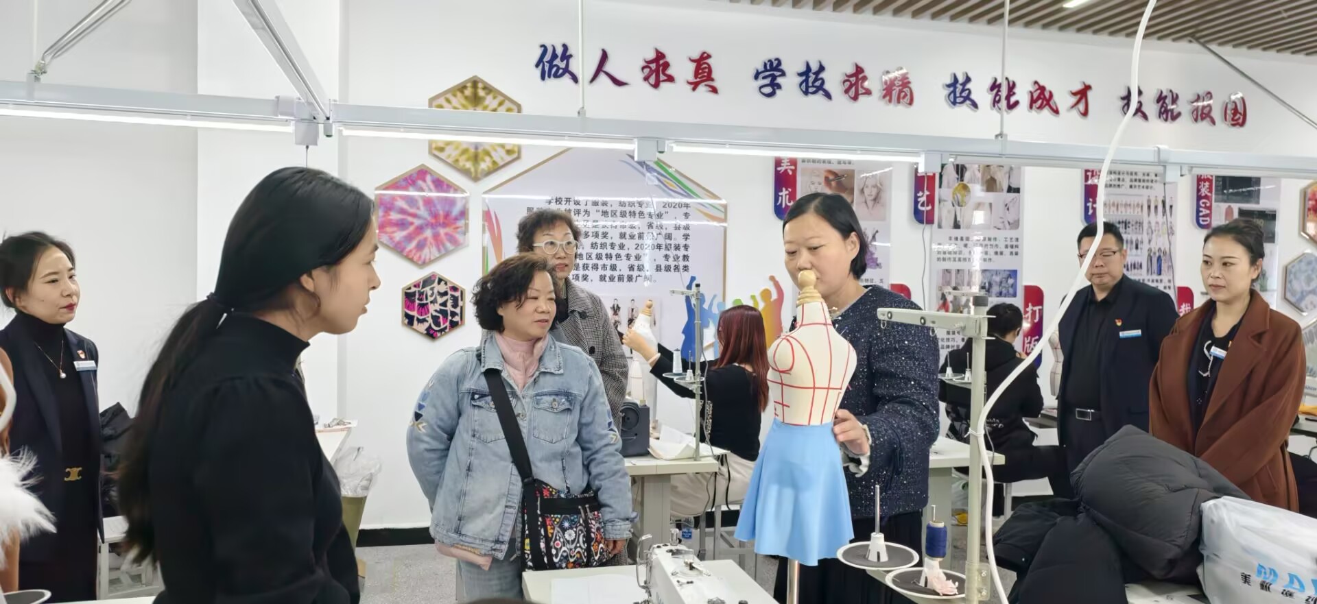 座谈会上,化工与环境工程学院党总支书记李晓华详细介绍了学校的办学理念、发展历程及核心办学特色,并阐述了学院在产教融合、校企合作方面的探索与实践。戚丽萍老师结合自身四十年深耕兵团工艺美术服装设计领域的经历,介绍了新疆及兵团传统手工艺的传承现状与发展前景,对民族服饰纹样设计、传统工艺创新应用等内容进行了深入解读。芦云老师从非遗传承的角度,分享了自身在传统技艺保护与教学转化方面的经验,提出非遗文化融入职业教育的具体思路。蔡永红老师结合行业需求,分析了当前服装手工艺品的市场趋势与人才需求标准,为专业人才培养提供了行业视角。随后,兵团工艺美术专家一行实地参观了服装综合实训室,对实训室的设备配置、实训项目开展情况进行细致考察,询问学生实训作品的设计理念与制作工艺,并针对实训教学中的细节提出指导建议。实训课程研讨环节,与会双方围绕“传统工艺与现代服装设计融合”“实训课程内容优化”“技能大赛备赛技巧”等核心议题展开深入交流。