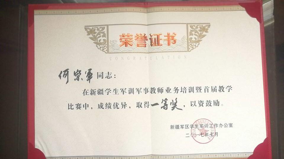 7月1日至4日,自治区教育厅和新疆军区参谋部在乌鲁木齐举办“首届新疆学生军训军事教师教学比赛”,学院选派水建分院何崇军老师在全疆29所普通高校和高职院校参赛选手中脱颖而出,荣获一等奖。