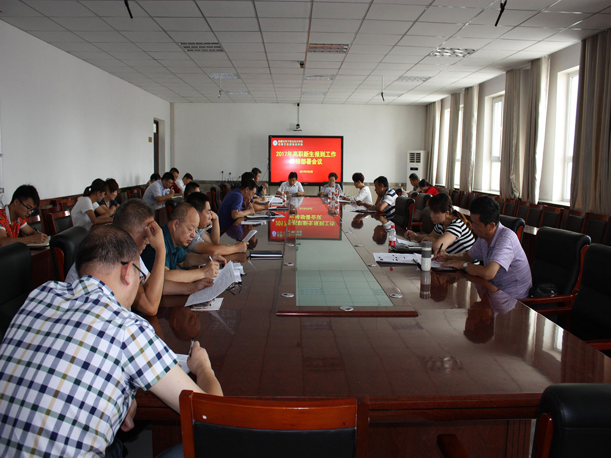 为贯彻落实国务院、兵团、师市关于开展2017年秋季开学工作专项督导检查文件精神,加强对迎新工作的领导、组织与协调,确保2017级高职新生入学各项工作安全、有序、优质、高效地进行, 9月6日上午,学院召开专门会议部署2017年高职新生入校报到工作,学院党委书记陈建丽、院长王敏弦、副院长王华东、纪委书记周赞梅、副院长耿荣及各分院、相关部门参加了会议。会议由王华东副院长主持。