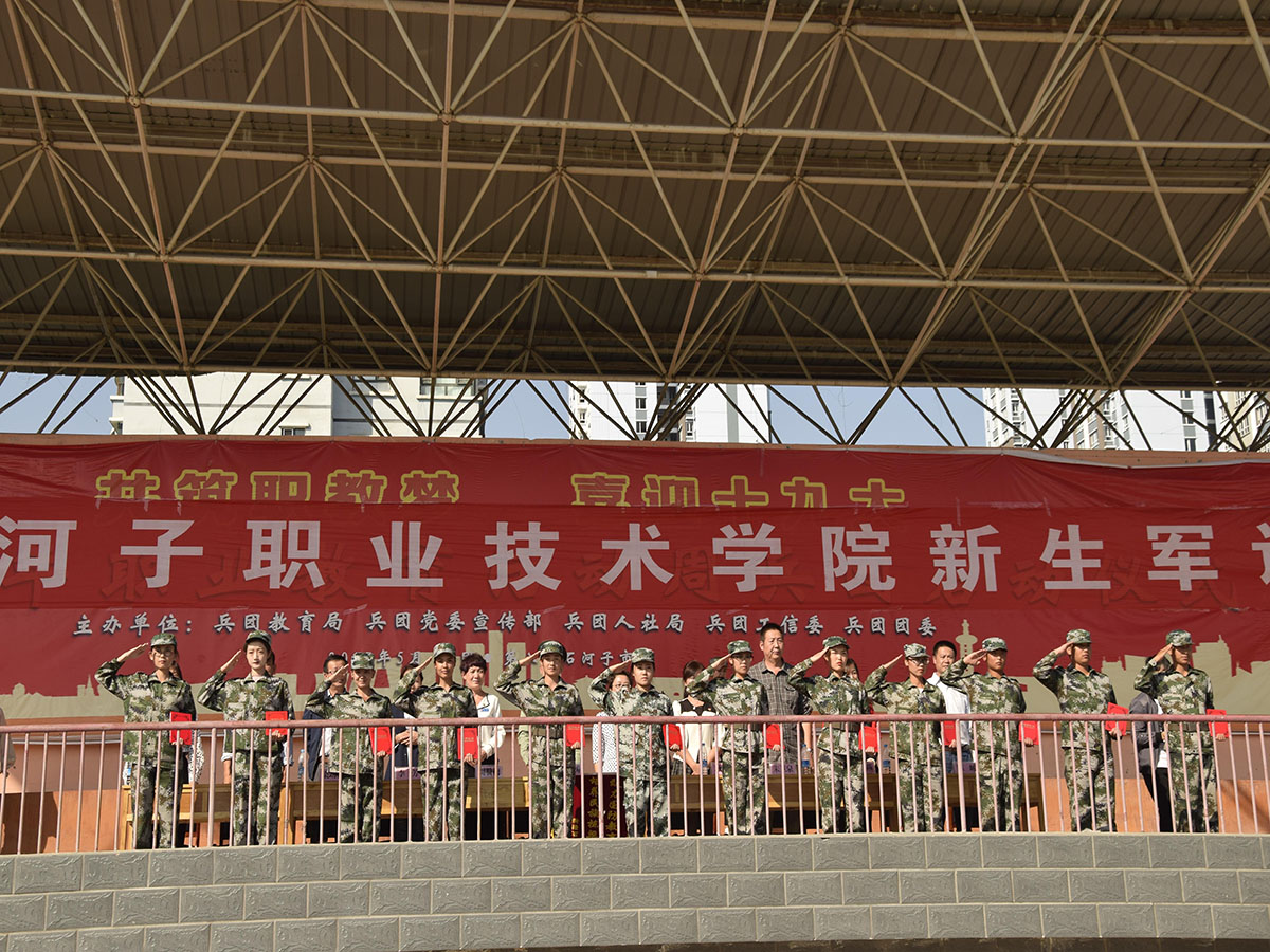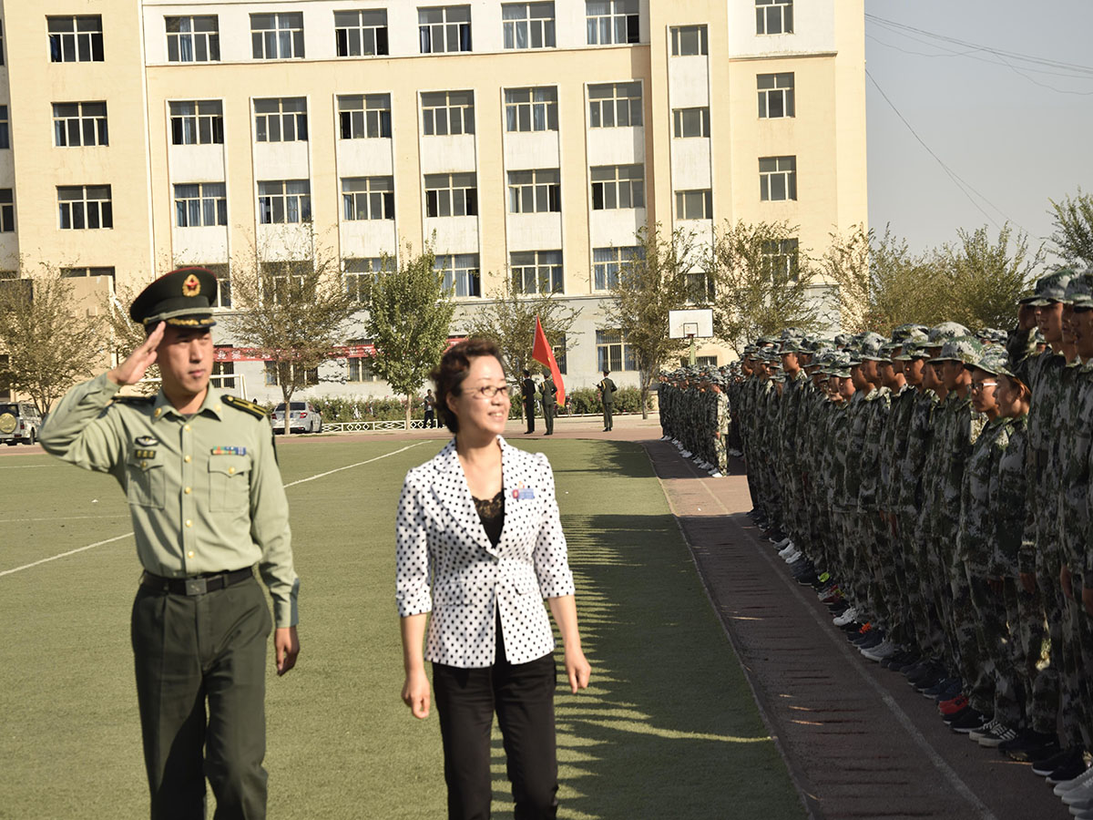 总结大会上,学院党委书记陈建丽在解放军驻石河子大学国防生选培办祝朋涛少校的陪同下检阅了受阅部队。随后,2100余名高职新生、200名中职叶城班新生组成9个方队迈着坚定的步伐、喊着响亮的口号、依次整齐有序地走过主席台。2017级新生们用饱满的精神、标准的军姿为“大学第一课”交上了一份满意的答卷。由173名同学组成的军体拳方阵进行了军体拳表演,88人组成的队列方阵进行了队列表演。